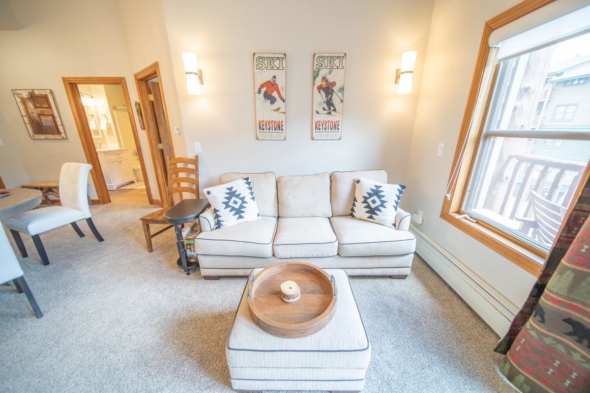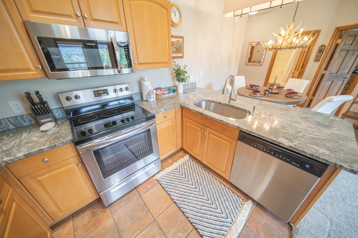 Step inside and you'll feel right at home in this beautifully appointed 2 bedroom, 2 bathroom condo. The living area features comfortable seating, a cozy gas fireplace, and a large flatscreen TV perfect for movie nights after a long day of skiing or snowboarding. The fully equipped kitchen is stocked with everything you need to whip up meals for your group, with a dining table that seats four for family meals and game nights.