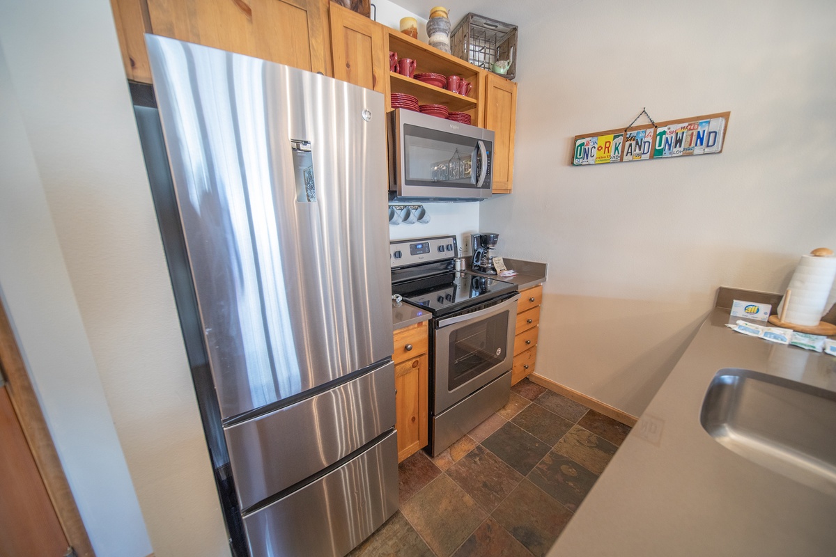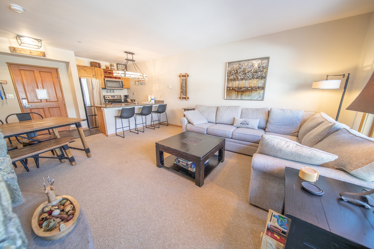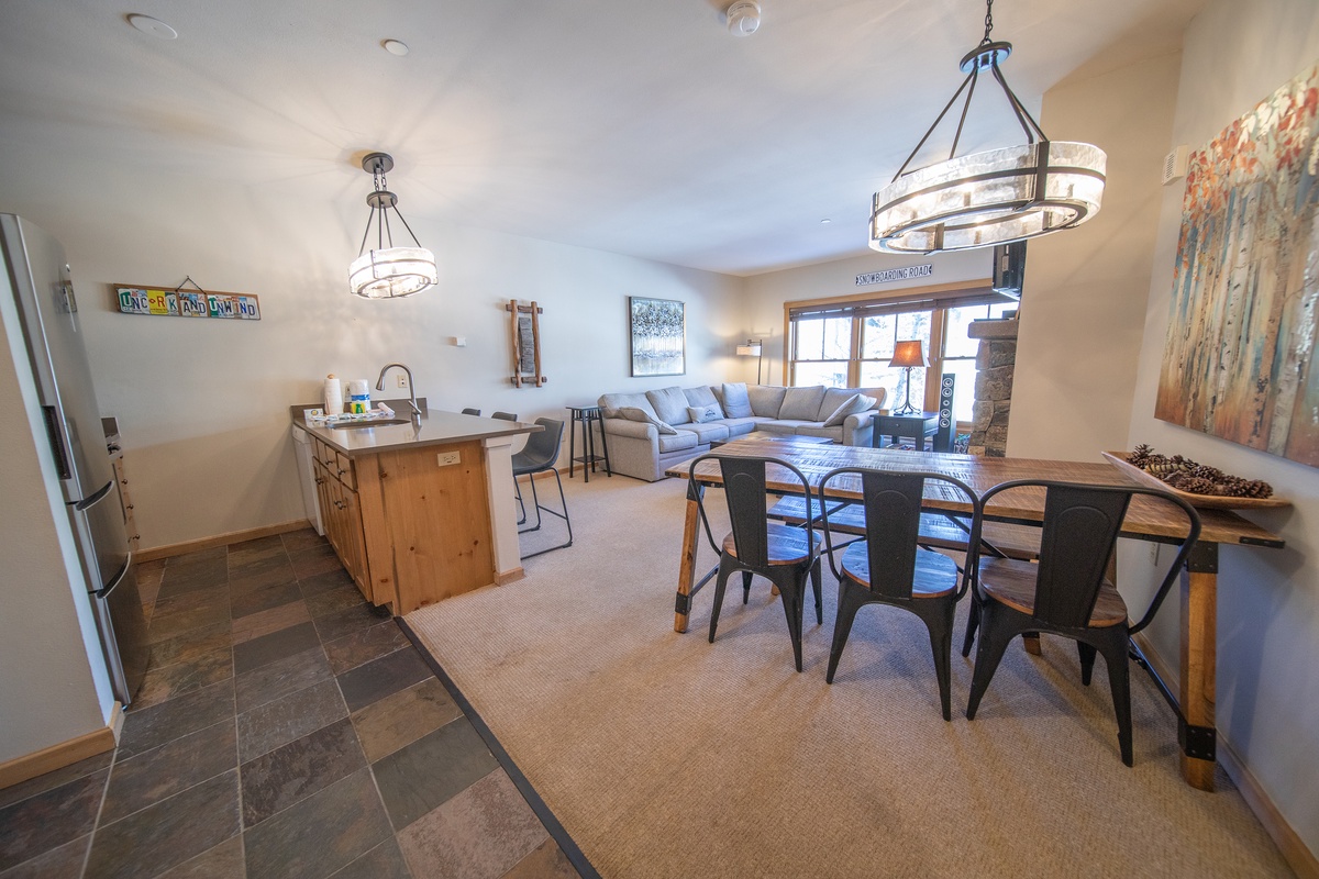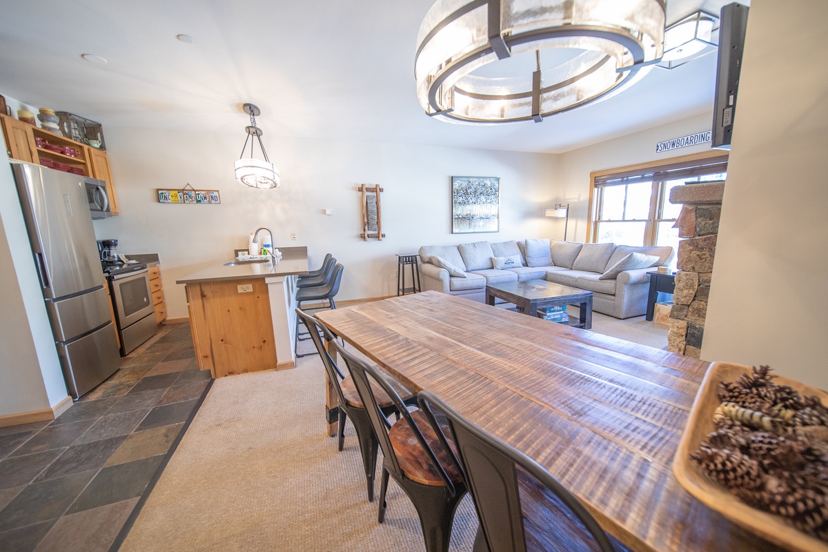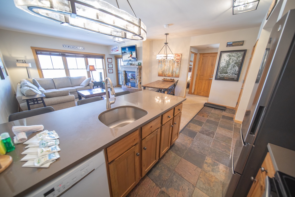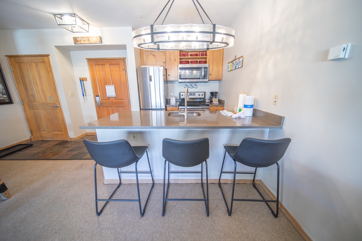 Experience the ultimate mountain getaway at this exceptional 1-bedroom, 1-bath condo located in the heart of River Run Village. As you step inside, you'll be greeted by a warm and inviting atmosphere that combines modern comforts with rustic charm. This property was recently completely renovated in a mountain modern design style. The stylishly furnished living area offers a cozy fireplace and large sectional sofa, perfect for snuggling up after a long day on the slopes. Prepare delicious meals in the fully equipped kitchen, complete with sleek stainless appliances and ample counter space. The bedroom provides a serene retreat with plush bedding and tasteful decor, ensuring a restful night's sleep. Plus, a patio door leads you out to the incredible village view balcony, where you'll love people watching during a summer festival or on a winter's morning while the snow falls.