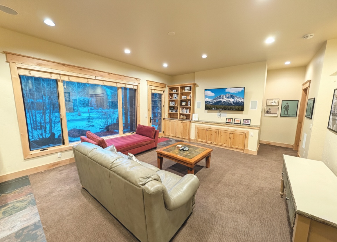 Beyond the main living spaces, the home offers a plethora of entertainment options. The dedicated media room where guests can sink into sumptuous seats and enjoy a movie night gives a place to gather at the end of the day. And for those looking to truly relax, the outdoor hot tub provides a secluded space to unwind while taking in the views.