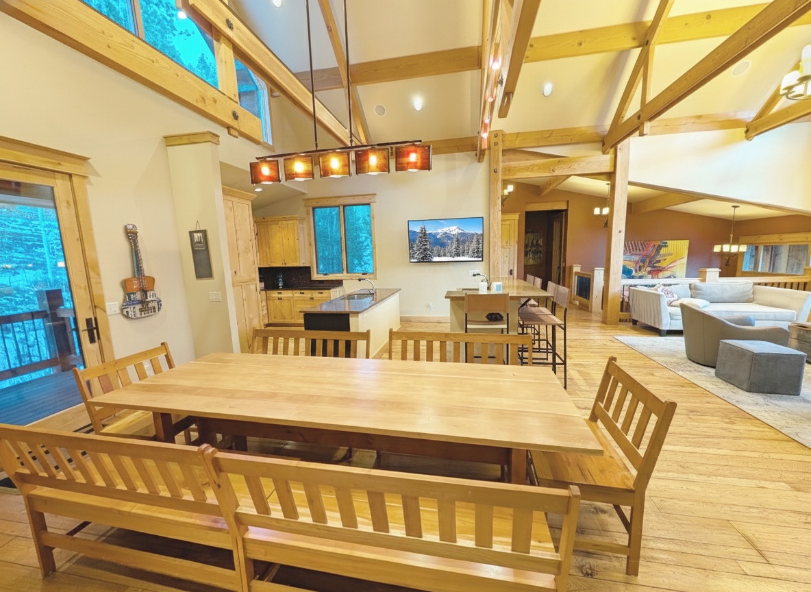 Step inside, and you are greeted by a symphony of rustic charm intertwined with modern sophistication. The vast living area is adorned with rich wooden beams, a grand fireplace, and luxurious furnishings – all designed to provide an ambiance of relaxation and warmth after a day on the slopes. The expansive open-plan design ensures that whether you're enjoying the intimate seating areas, indulging in a gourmet meal in the dining area, or preparing a feast in the state-of-the-art kitchen, you're always connected with family and friends, not to mention the mesmerizing views outside.
