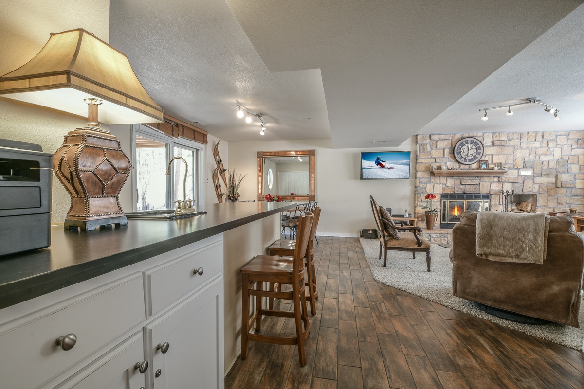 As you arrive at the Lazy K Mountain Home, you'll be greeted by a picturesque exterior that perfectly complements the natural surroundings. Step inside, and you'll be instantly captivated by the warm and inviting atmosphere. The stunning open-concept living area, adorned with vaulted ceilings and large windows, welcomes an abundance of natural light, creating a bright and airy ambiance. Plush seating invites you to unwind and cozy up around the fireplace, providing the perfect setting for après-ski relaxation.