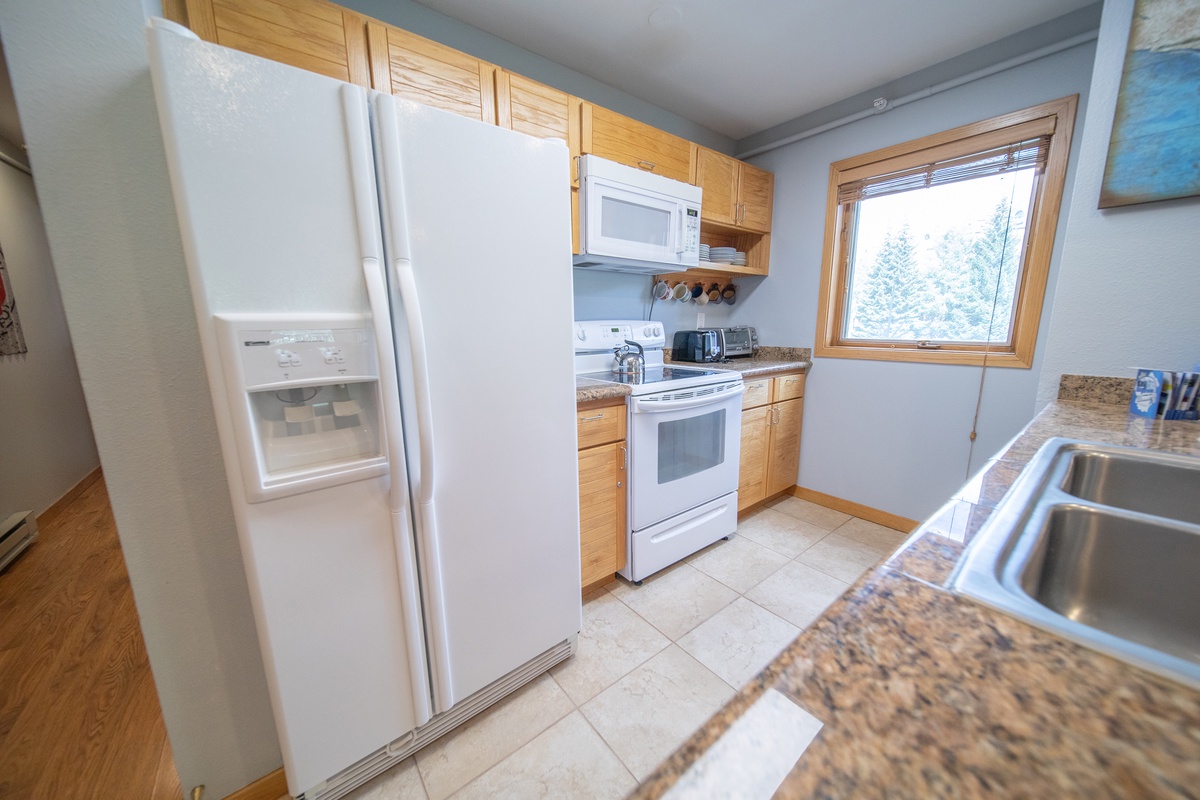 Upon entering, you'll be welcomed by a warm and inviting atmosphere, complemented by tasteful furnishings and decor that create a serene space for relaxation. The living area is designed for comfort, featuring plush seating and large windows that fill the room with natural light. After a day of skiing or exploring nearby trails, settle in front of the wood-burning fireplace and admire the stunning mountain vistas. The open-concept kitchen is fully equipped with modern appliances, perfect for preparing a delicious meal or a quick snack.