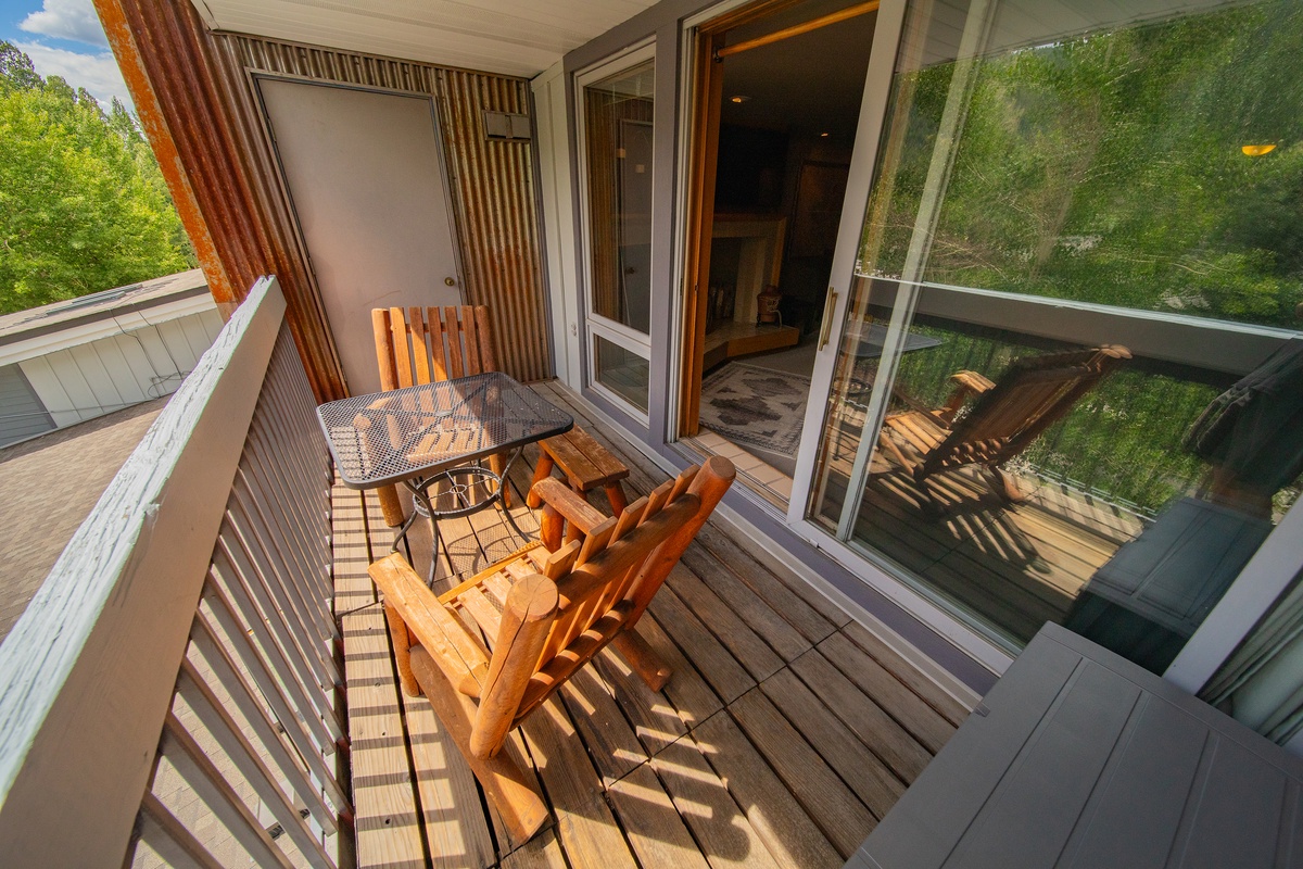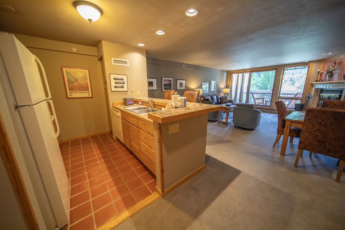 Inside, the open-concept living area is bathed in natural light, thanks to large windows that provide access to the private balcony. A plush sofa and armchair provide the perfect spot to relax by the fireplace, while the well-equipped kitchen offers everything you need to prepare a hearty meal. Enjoy your morning coffee on the private balcony, where you can take in the crisp mountain air and views of the ski mountain.