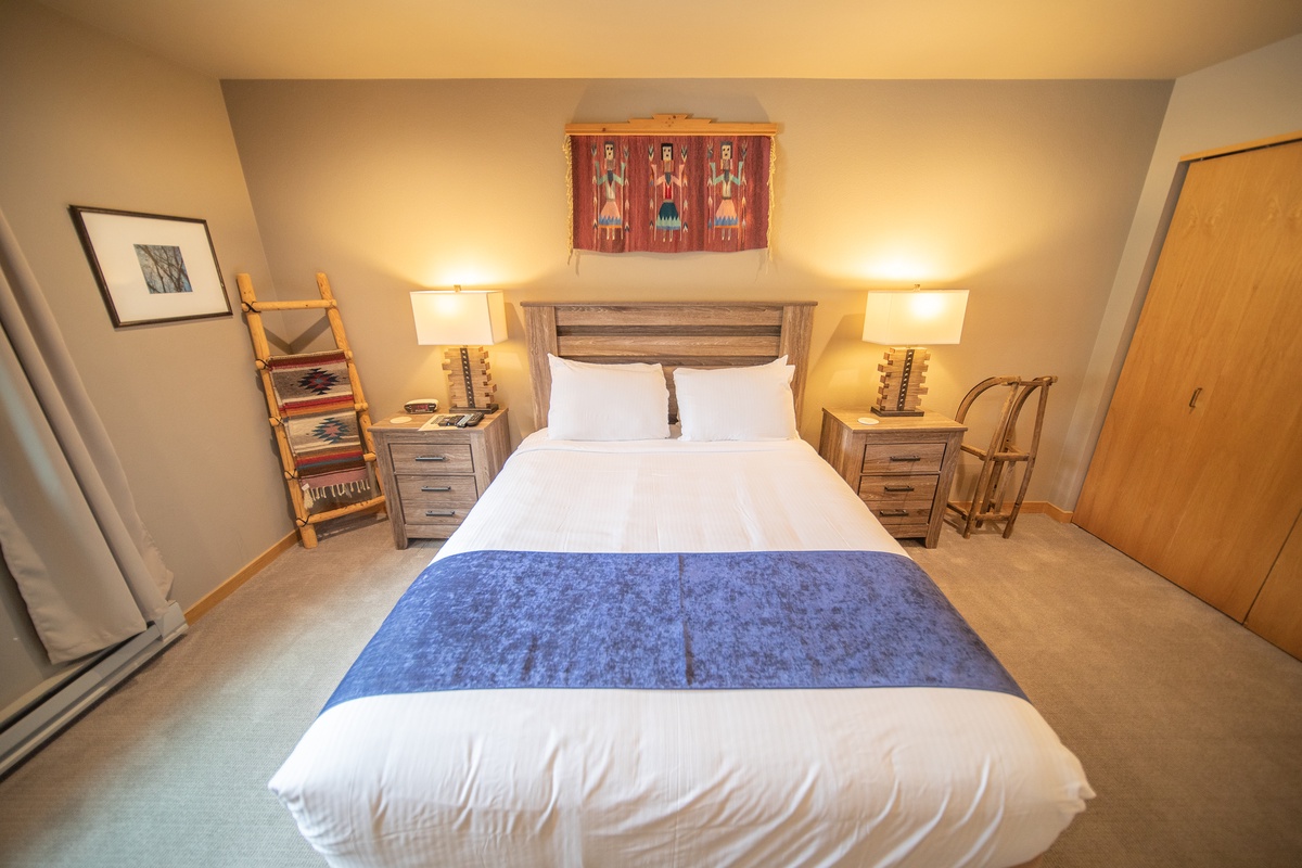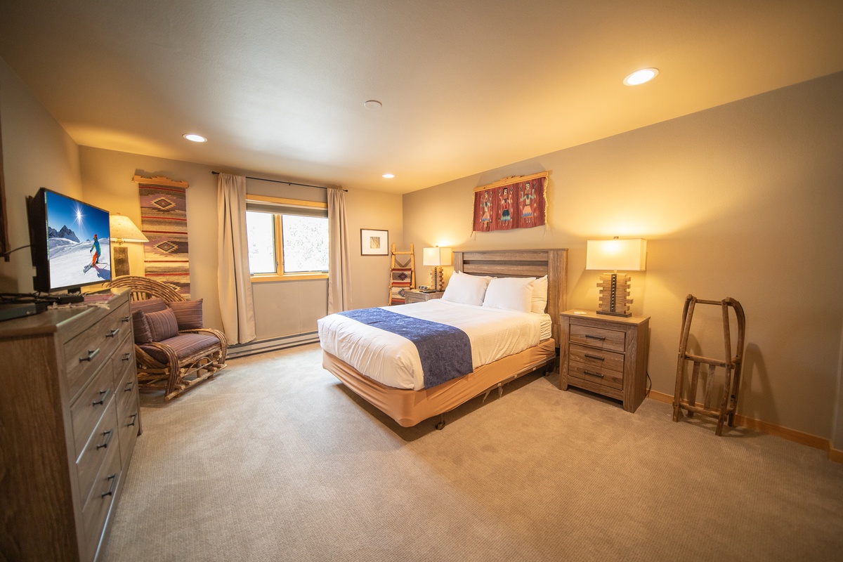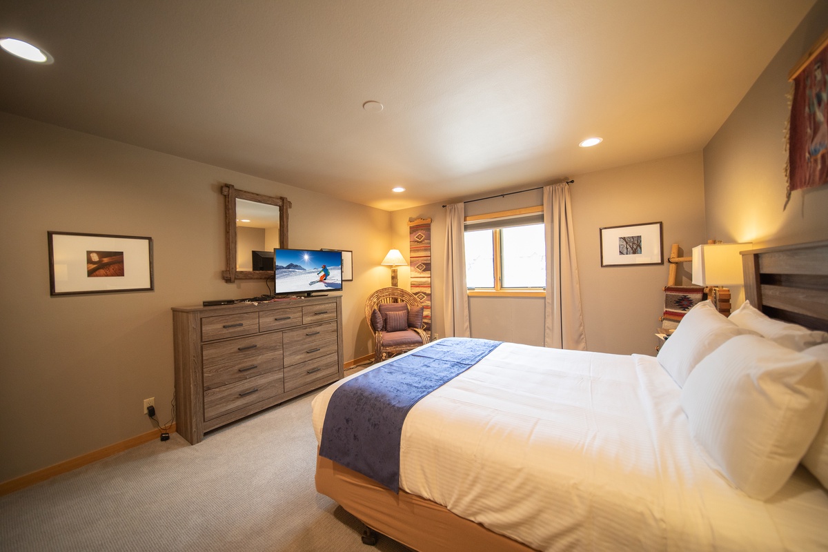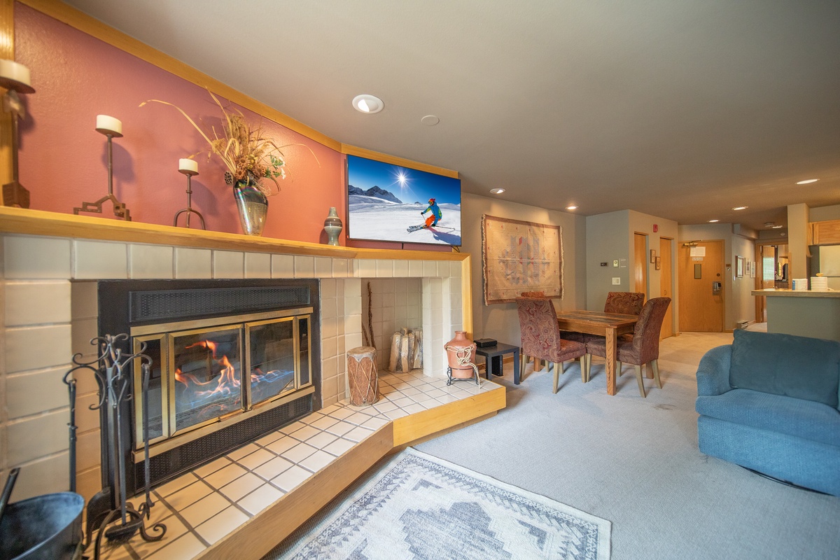 Liftside 203 is the perfect retreat for skiers, hikers, and anyone looking to unwind in a serene mountain setting. The wood burning fireplace is a unique feature. Your group will love hearing the crackling wood while warming up after a full day on the slopes. The condo’s warm, inviting ambiance is enhanced by its rustic décor, creating a homey feel that invites you to relax and recharge after a day of exploring.