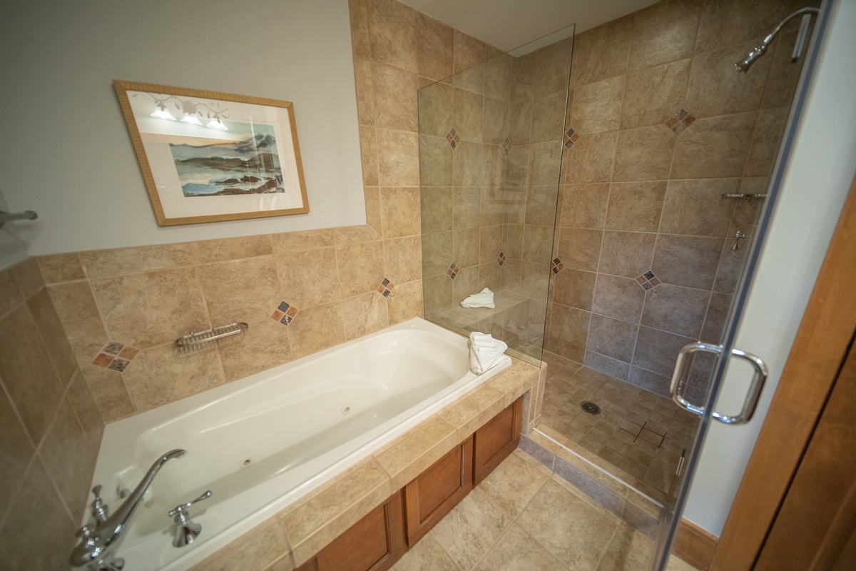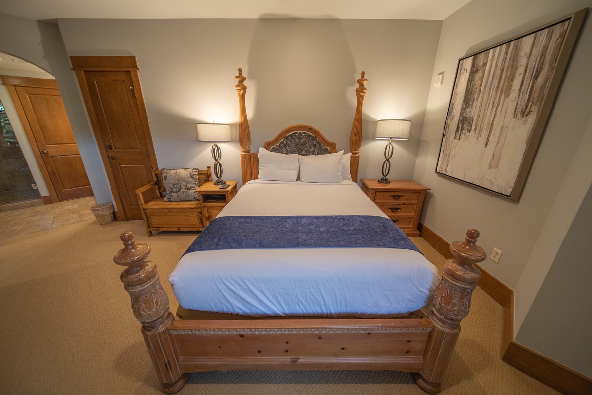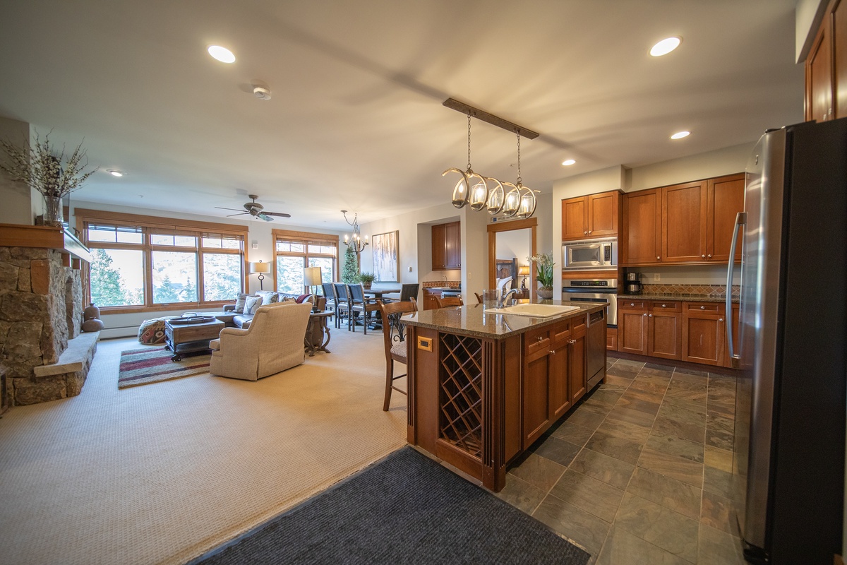 The open-concept living area boasts large windows that fill the space with natural light, providing stunning views of the surrounding scenery. Gather around the and warm up by the gas fireplace after a day of adventure. Or enjoy a movie night in the comfortable seating area. The fully equipped kitchen features modern appliances and plenty of counter space, perfect for whipping up hearty meals to fuel your adventures.