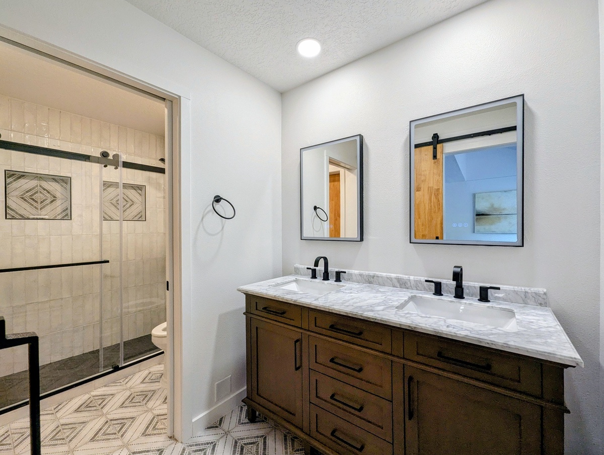 Both bedrooms offer tranquil havens for rest and rejuvenation. Your group will find ample space to spread out in either the main-level bedroom or the loft bedroom with an ensuite. The serene ambiance and comfortable furnishings create an inviting setting for a peaceful night's sleep. The two bathrooms are modern and well-appointed, ensuring everyone has the space they need to prepare for another day of exploration.