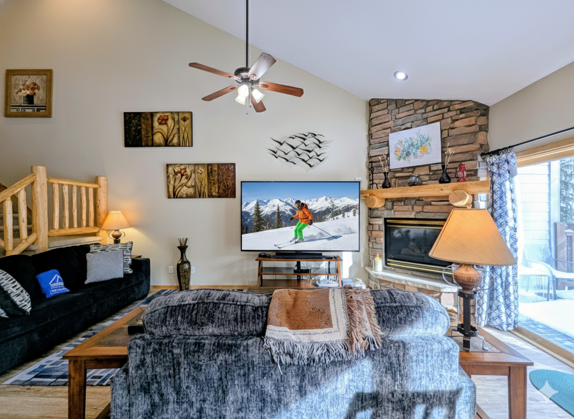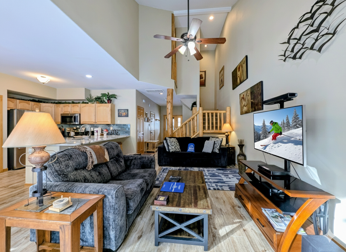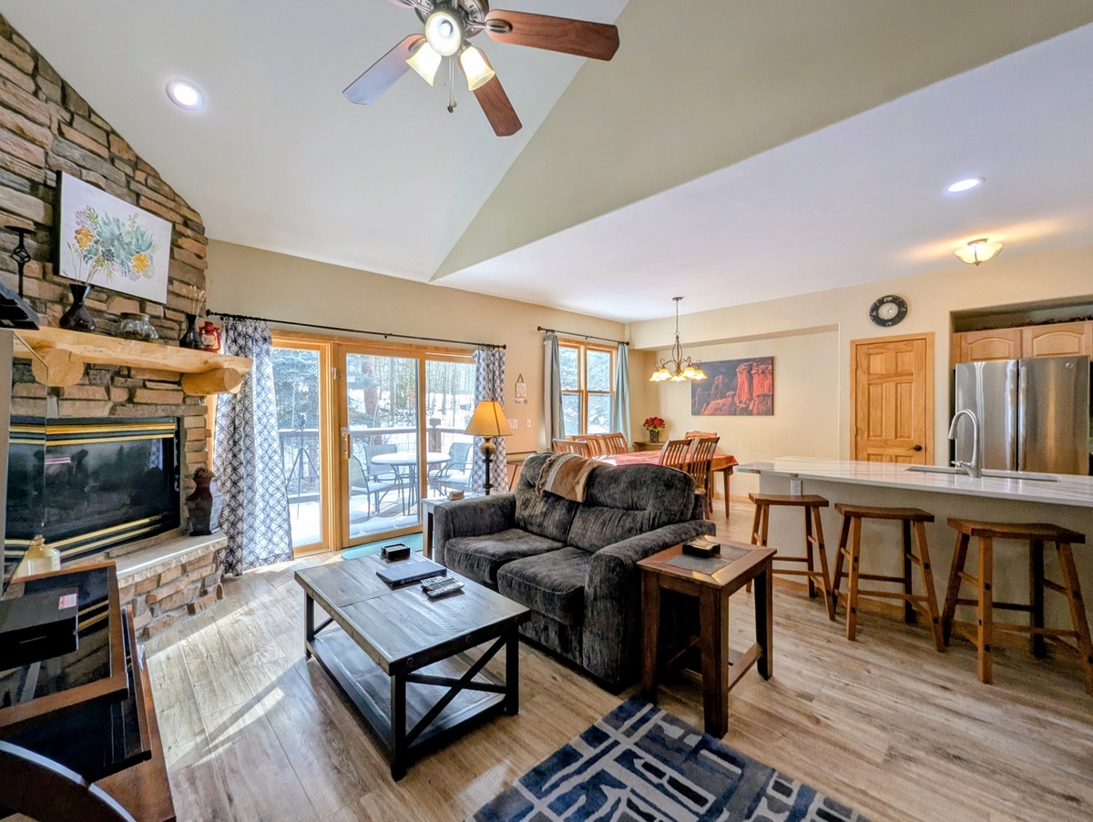 As you step into this spacious condo, you will be greeted by a warm and inviting living room, complete with a cozy fireplace and comfortable furnishings. The large windows allow plenty of natural light to flood the space, and the plush sofas are the perfect place to relax after a long day on the slopes.