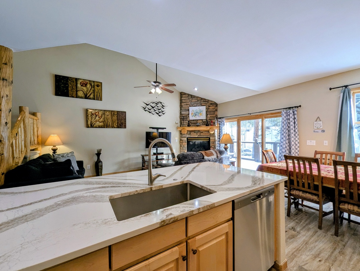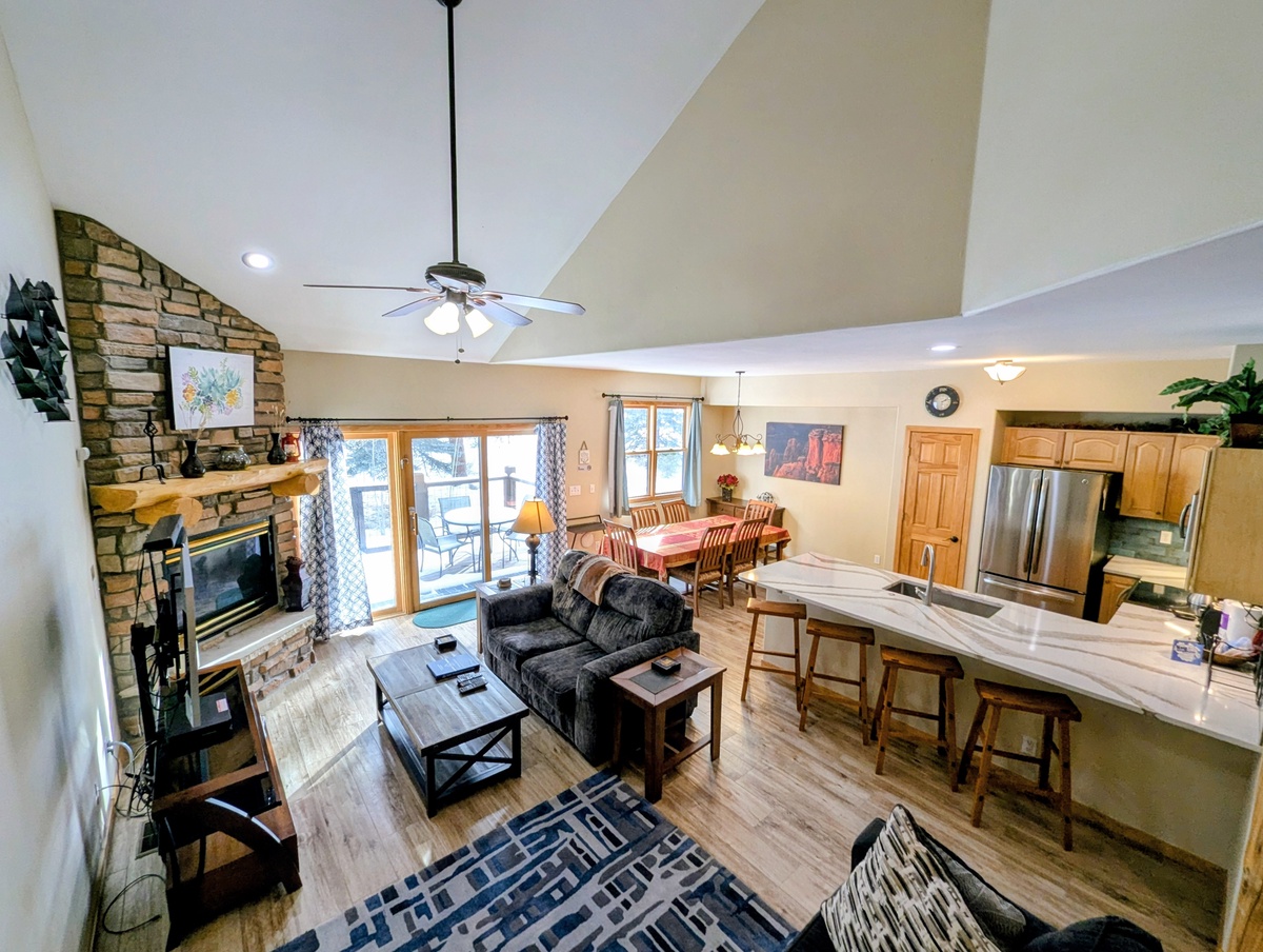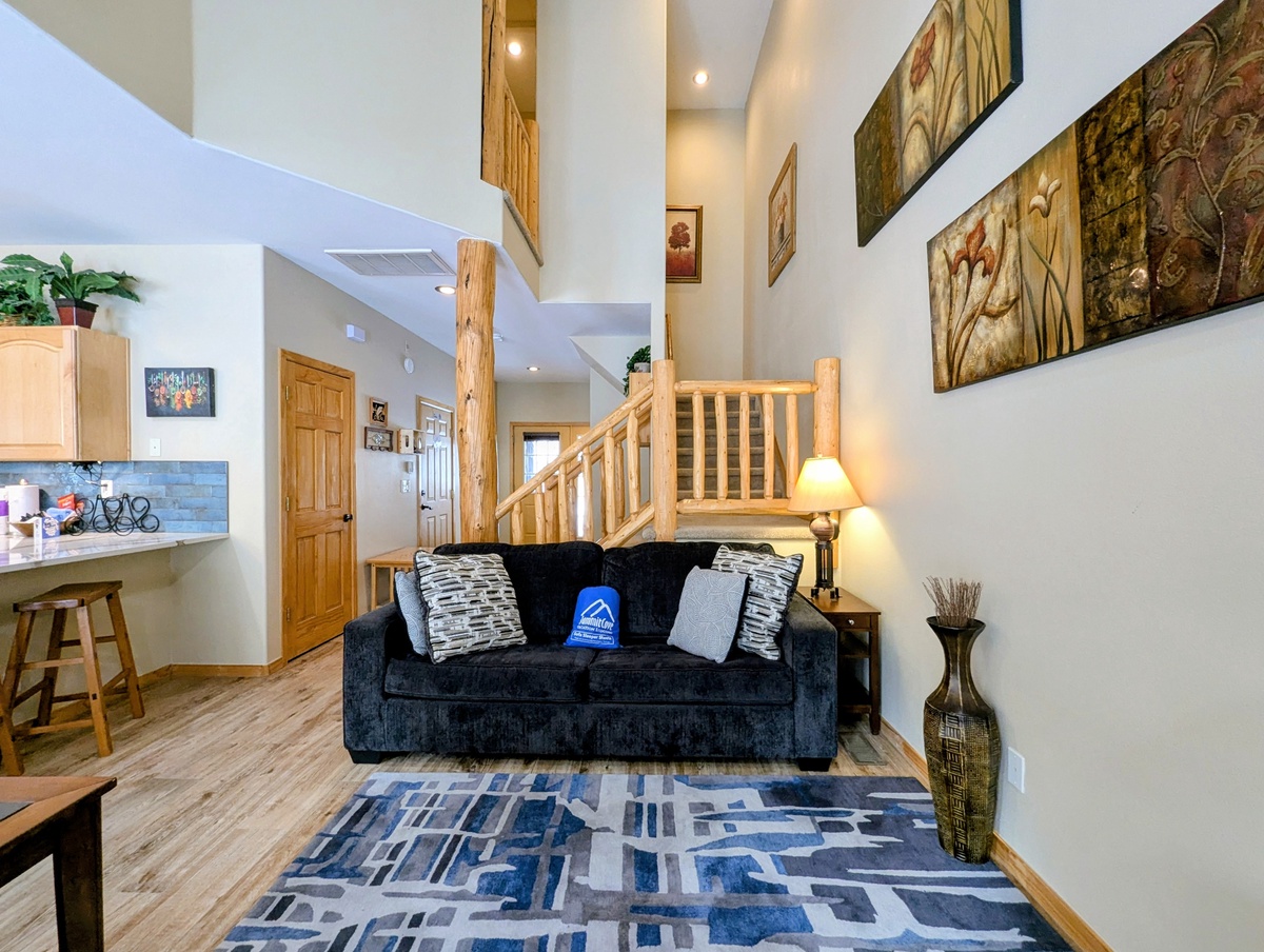 As you step into this spacious condo, you will be greeted by a warm and inviting living room, complete with a cozy fireplace and comfortable furnishings. The large windows allow plenty of natural light to flood the space, and the plush sofas are the perfect place to relax after a long day on the slopes.