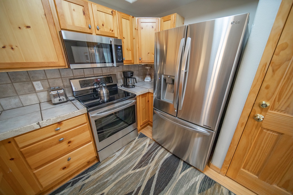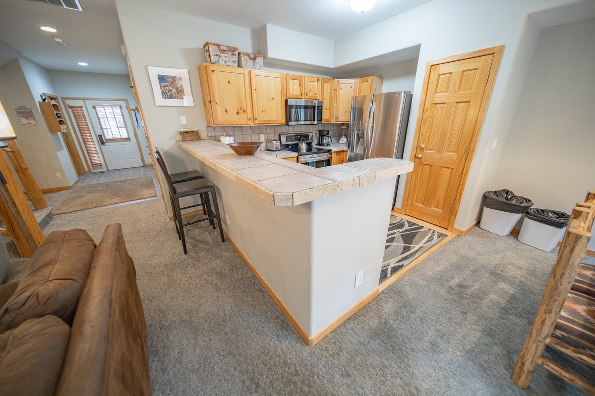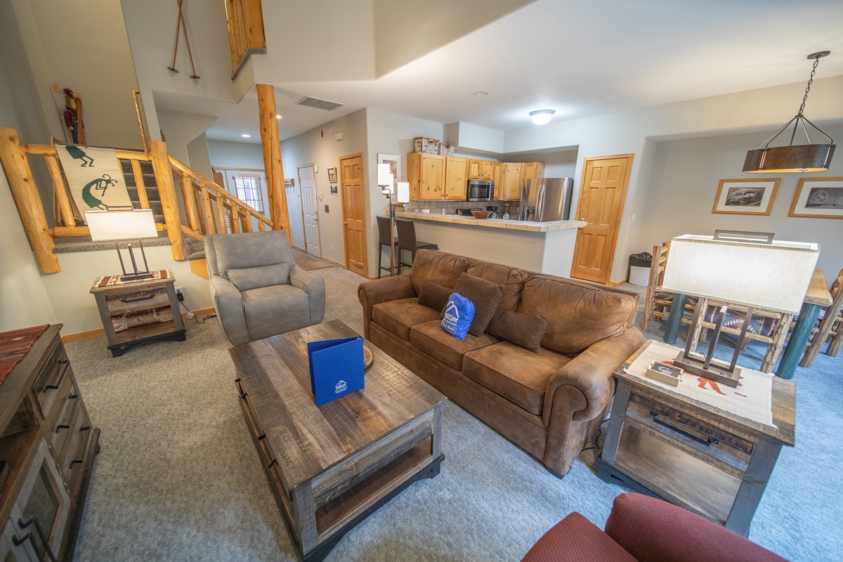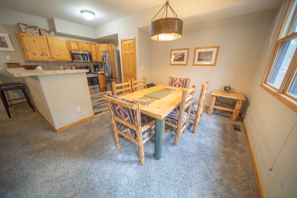 As soon as you step foot inside, you'll feel at home in the cozy living room, where you can snuggle up by the fireplace with a hot cup of cocoa after hitting the slopes. The living room features a large, comfortable sofa and a flat-screen TV for movie nights with loved ones. Adjacent to the living room, you’ll find the dining area and fully equipped kitchen, allowing you to cook up a gourmet meal after a long day of skiing.