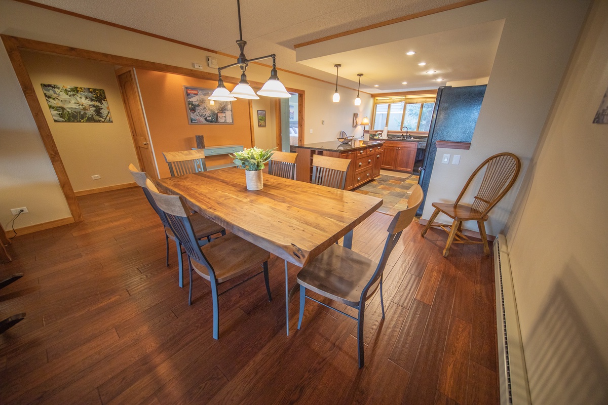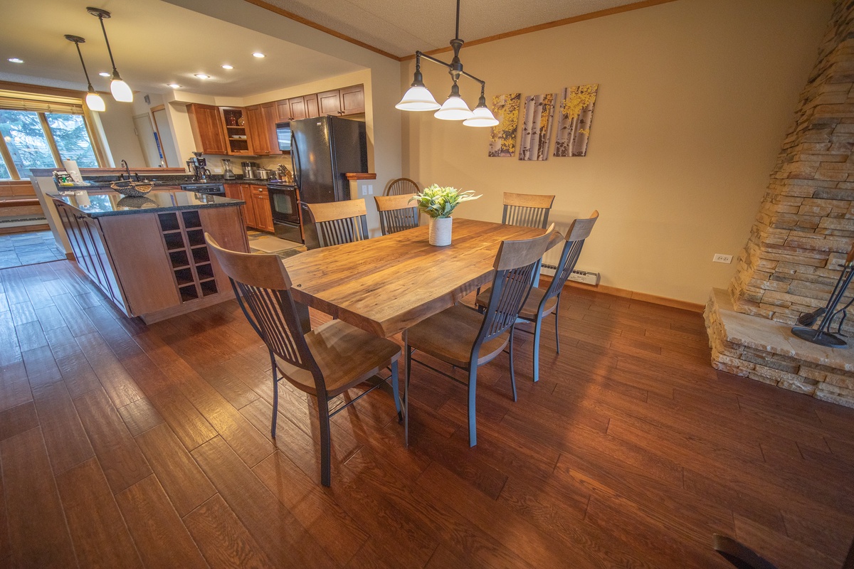 Upon stepping inside, guests are immediately greeted by a warm and inviting atmosphere, showcased beautifully in the open-concept living and dining area. Natural sunlight pours in through large windows, illuminating the space and providing breathtaking views of the surrounding mountain landscape. Sink into the plush sofa and relax in front of the stone fireplace, perfect for unwinding after a day of unparalleled adventures.