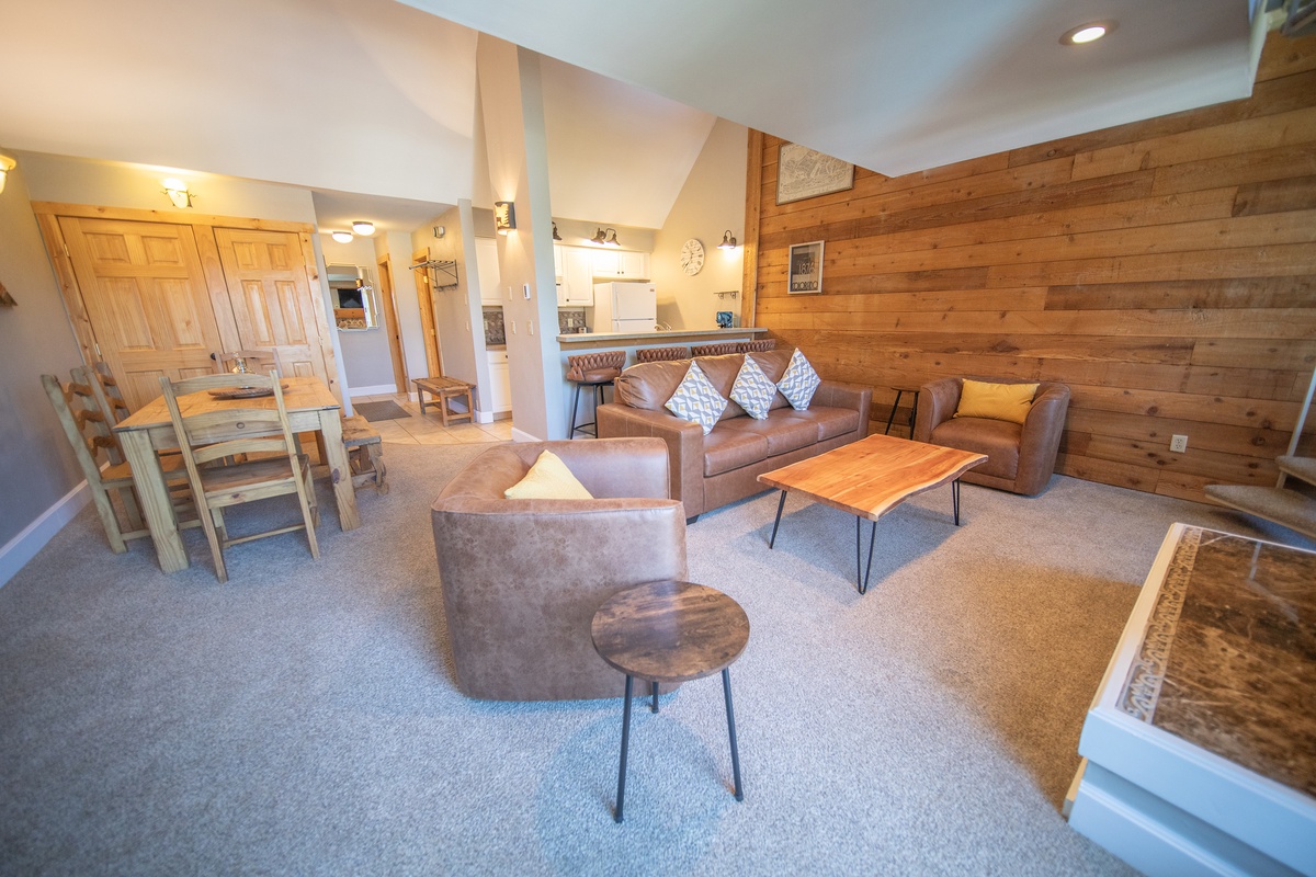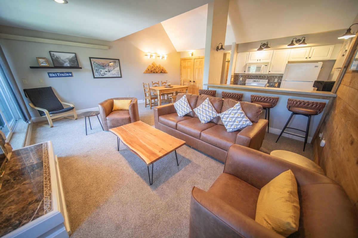 As you step inside, you'll immediately notice the condo’s warm, inviting ambiance, accentuated by the rustic charm of natural wood accents and modern touches that create a cozy yet sophisticated atmosphere. The spacious living area with a high ceiling features plush seating around a stone gas fireplace, ideal for unwinding after a day of exploring. Large windows frame beautiful views of the surrounding mountains and the swimming pool providing a serene feel to the condo.