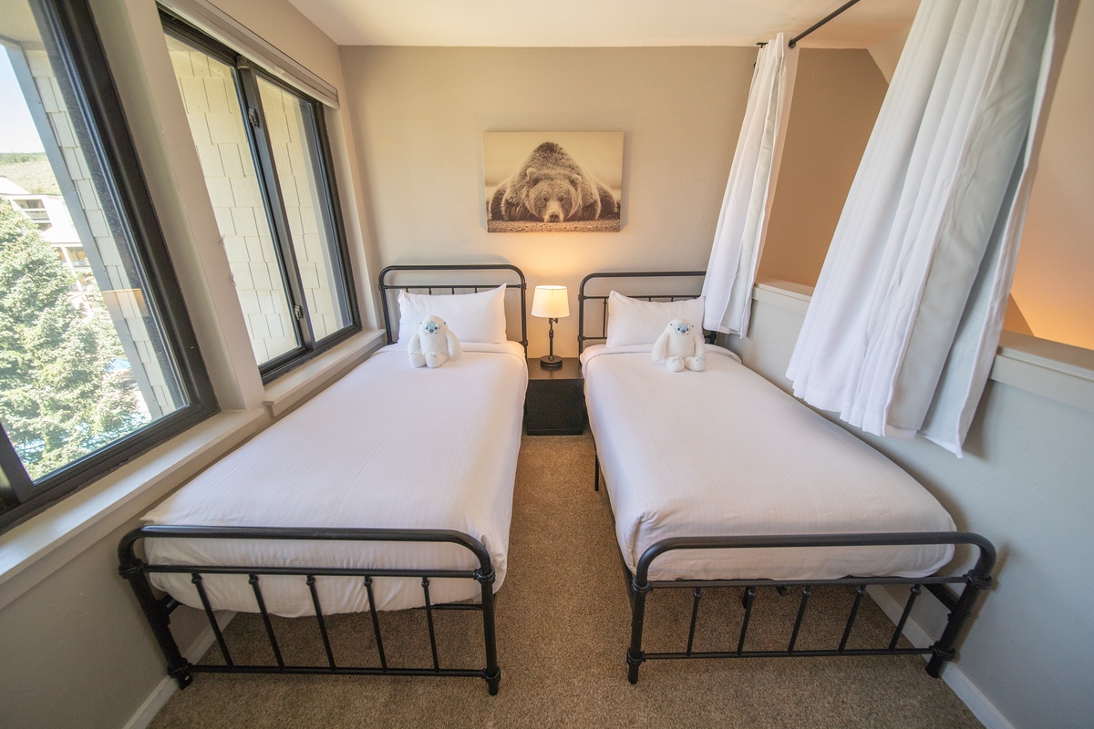 When it's time to rest, you'll find the primary bedroom to be a peaceful sanctuary, thoughtfully designed to provide maximum comfort. The loft bedroom is a great space for kids or traveling singles with two cozy twin beds. This loft has noise and light canceling curtains to provide extra privacy. Whether you’re traveling with family or friends, the sleeping arrangements can accommodate your group with ease (king bed, 2 twin beds, and sleeper sofa with memory foam.)