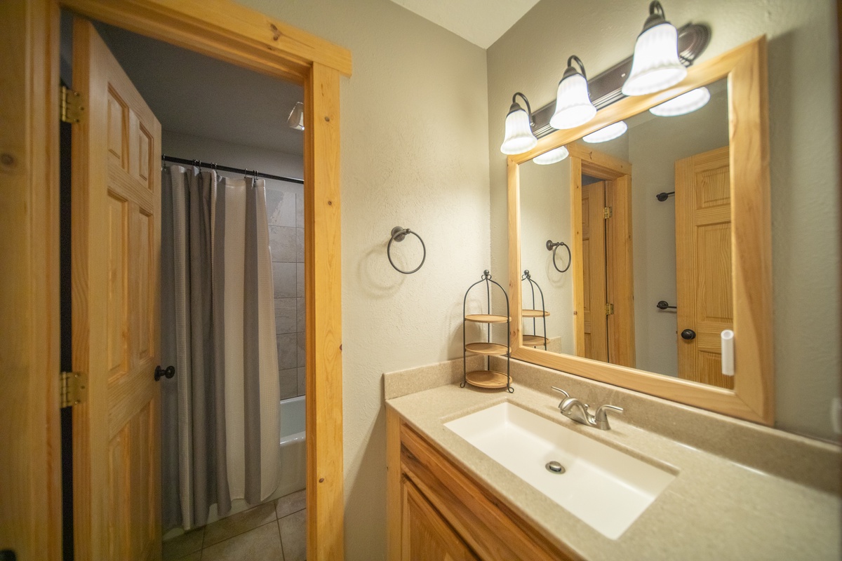 The bathroom is stylishly designed with modern fixtures and a separate vanity area, so multiple guests can get ready at once.