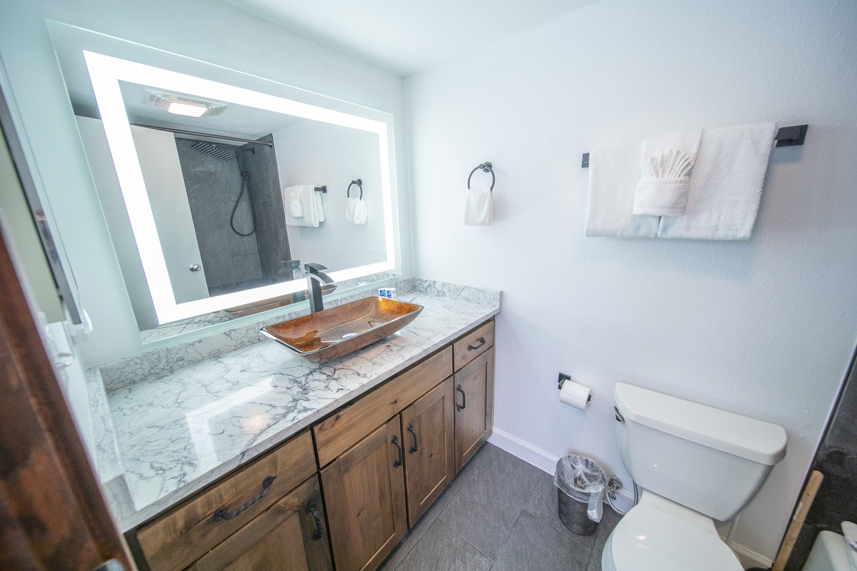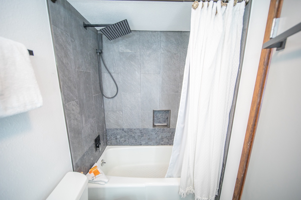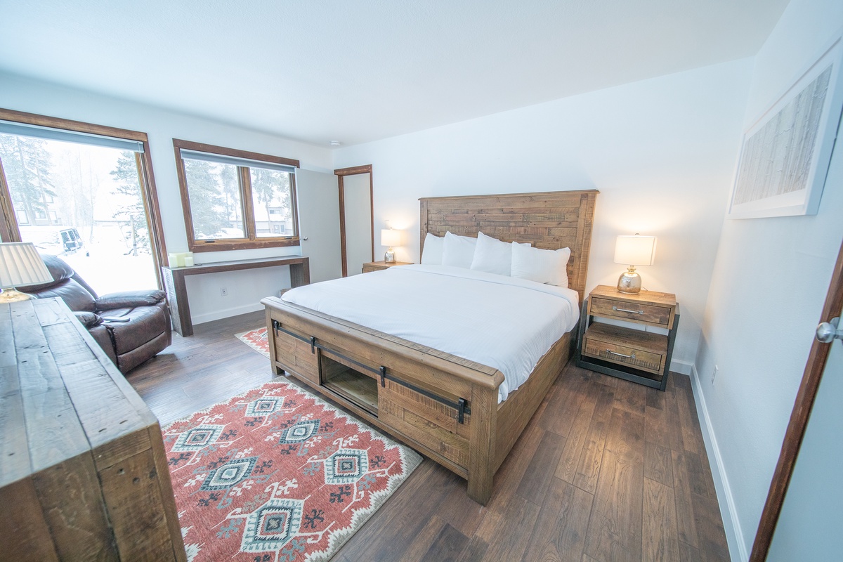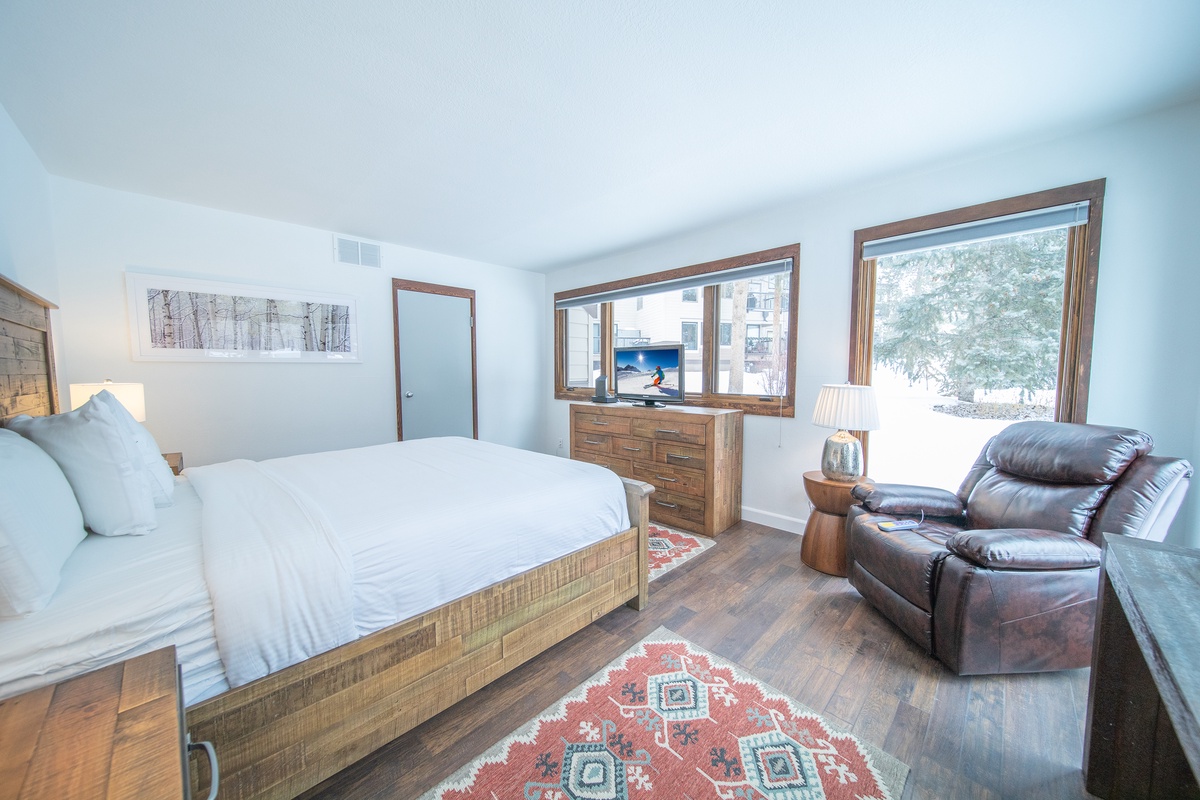 Snuggle up in the comfortable bed with available plush bedding that will send you off into a restful night's sleep. The spacious, relaxing bedroom is decorated in a contemporary mountain theme and offers ample storage options for your belongings. The condo's bathroom features a shower and bathtub, vanity sink, and available starter toiletries for your convenience.