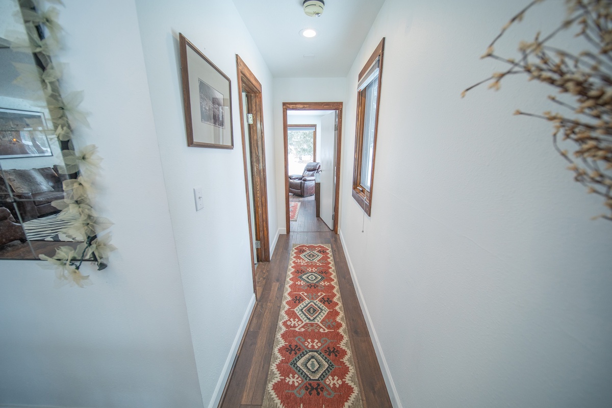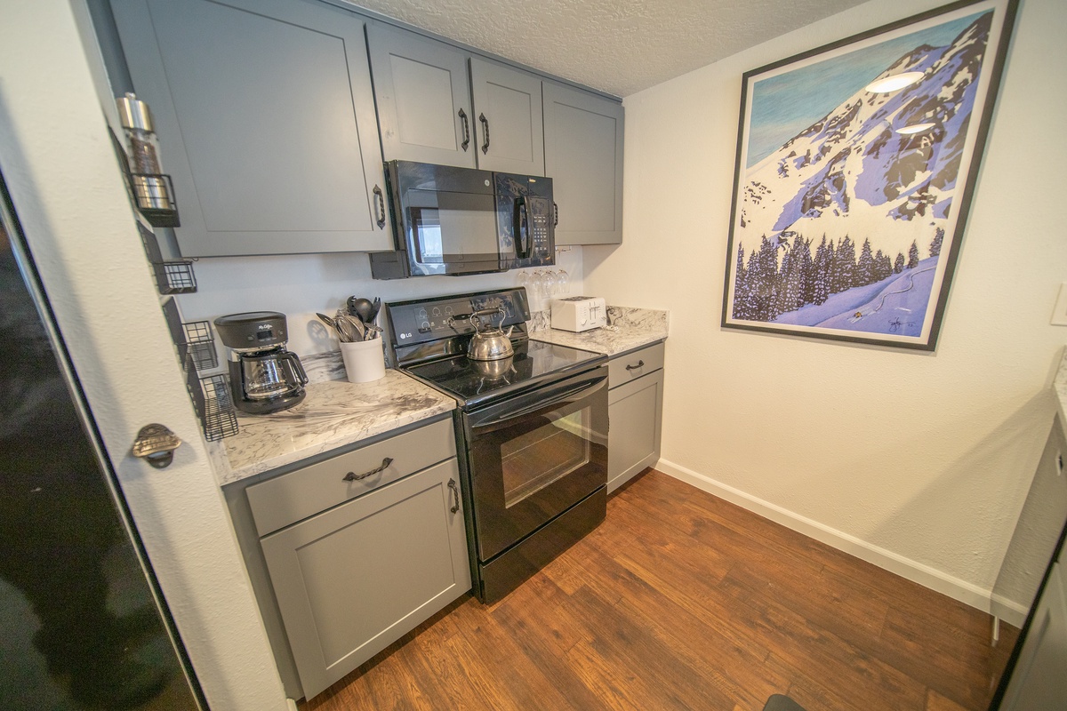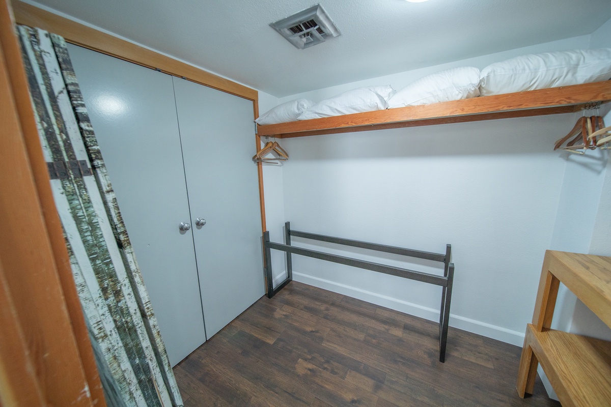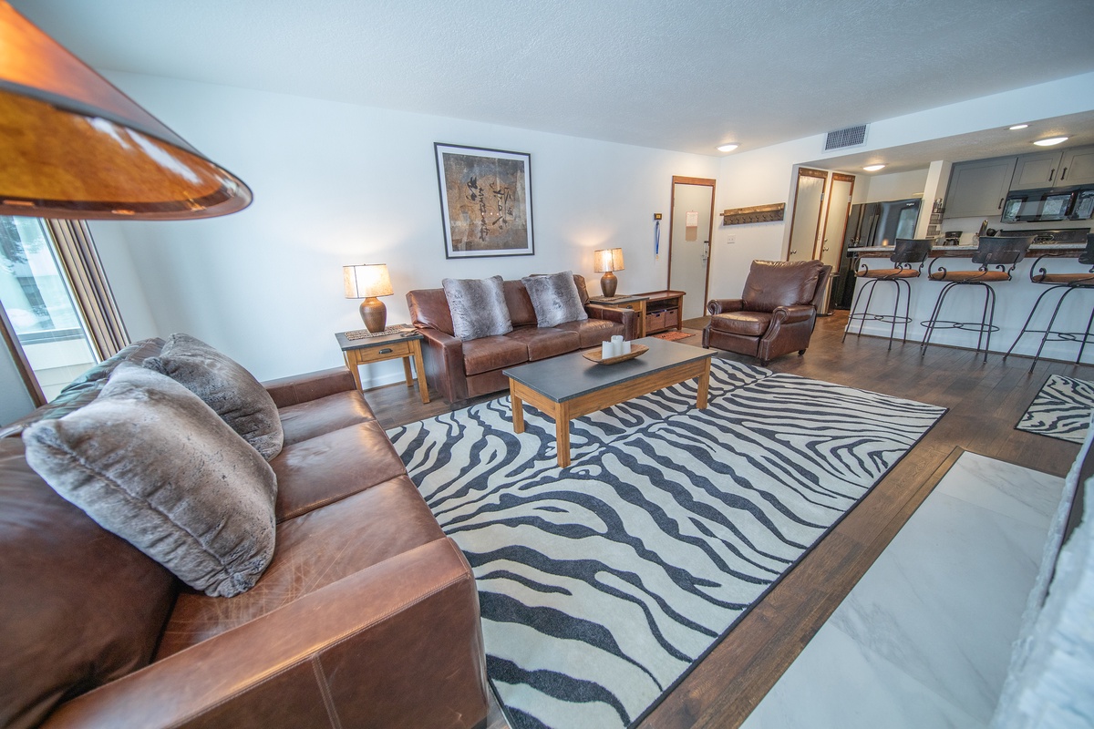 Snuggle up in the comfortable bed with available plush bedding that will send you off into a restful night's sleep. The spacious, relaxing bedroom is decorated in a contemporary mountain theme and offers ample storage options for your belongings. The condo's bathroom features a shower and bathtub, vanity sink, and available starter toiletries for your convenience.