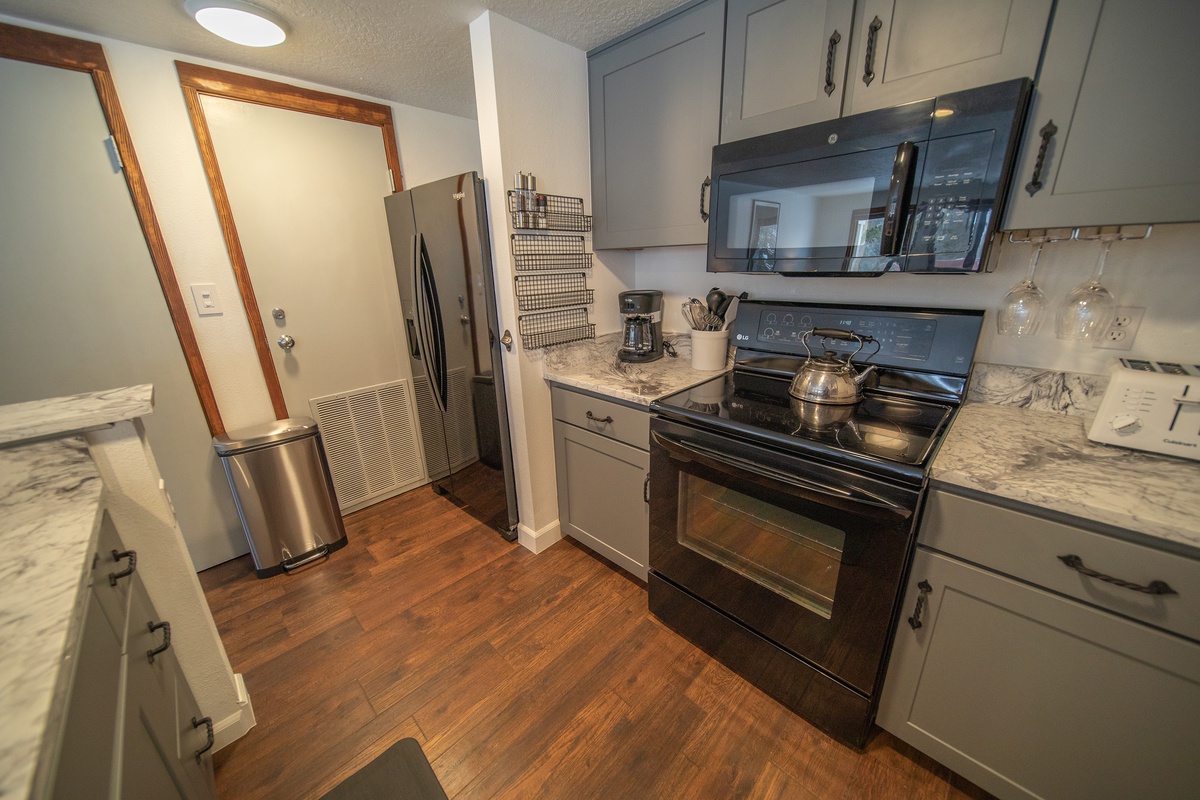 Enjoy a cup of coffee or cook breakfast in the kitchen furnished with a full range of appliances, including a refrigerator, stove, microwave, and dishwasher. The dining table is the perfect spot to enjoy meals or play games, and seating is also available for counter service. In addition to the entertainment provided by the TVs, there is also free Wi-Fi throughout the building, allowing guests to stay connected and stream their favorite shows and movies.
