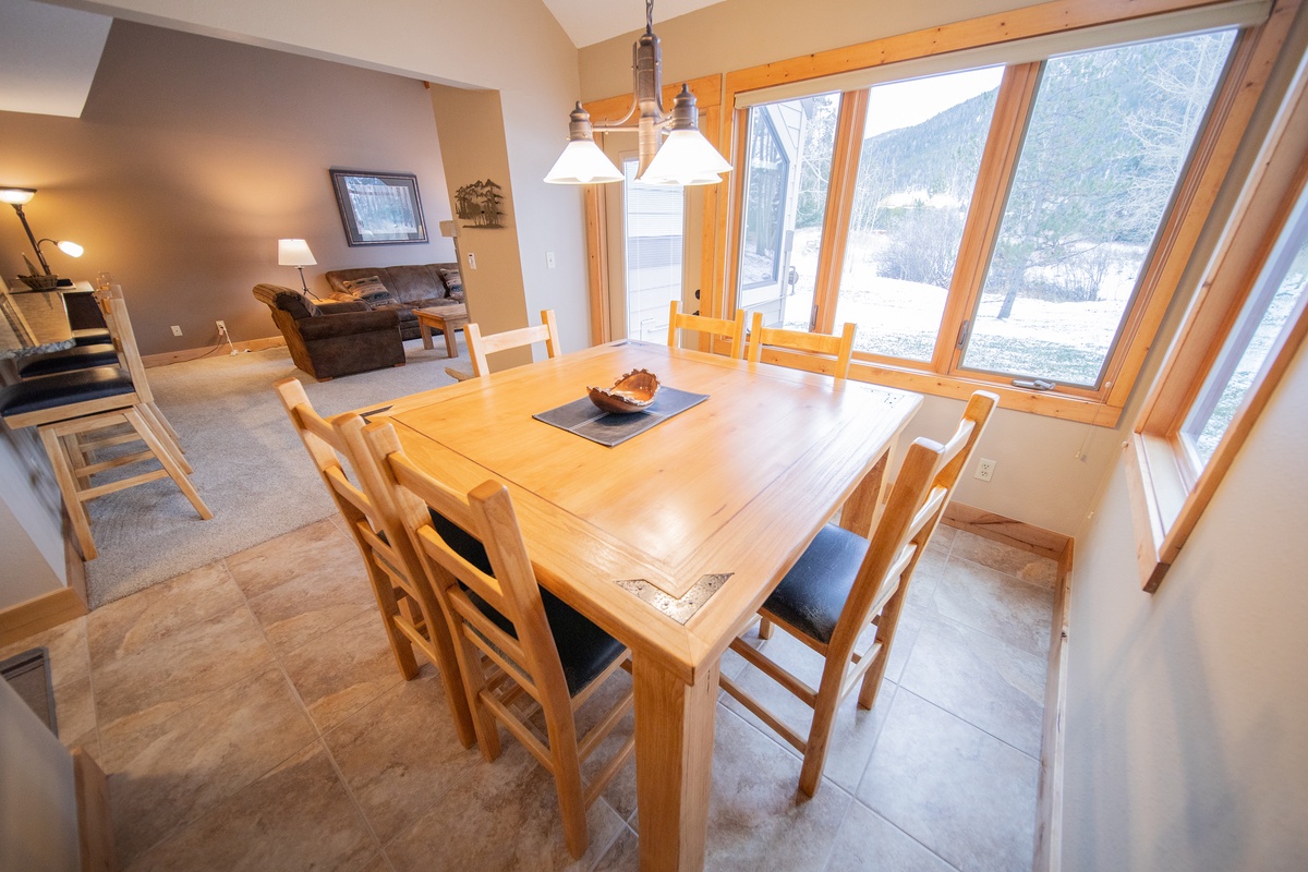 The interior features a spacious, open-concept living area designed for relaxing after a day in the mountains. Cozy furnishings, tasteful décor, and abundant natural light create an inviting space to unwind, watch a movie, or gather for conversation. The adjoining dining area and fully equipped kitchen make meals at home easy and enjoyable, whether you’re preparing a quick breakfast before hitting the slopes or a leisurely dinner after a full day of adventure.