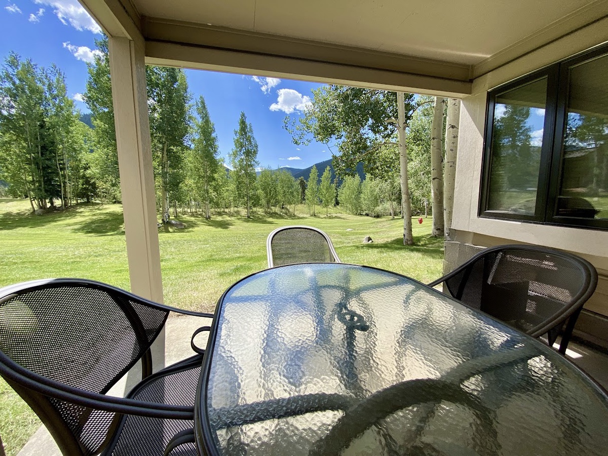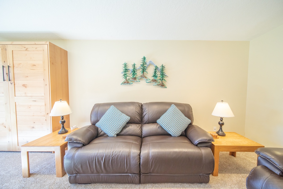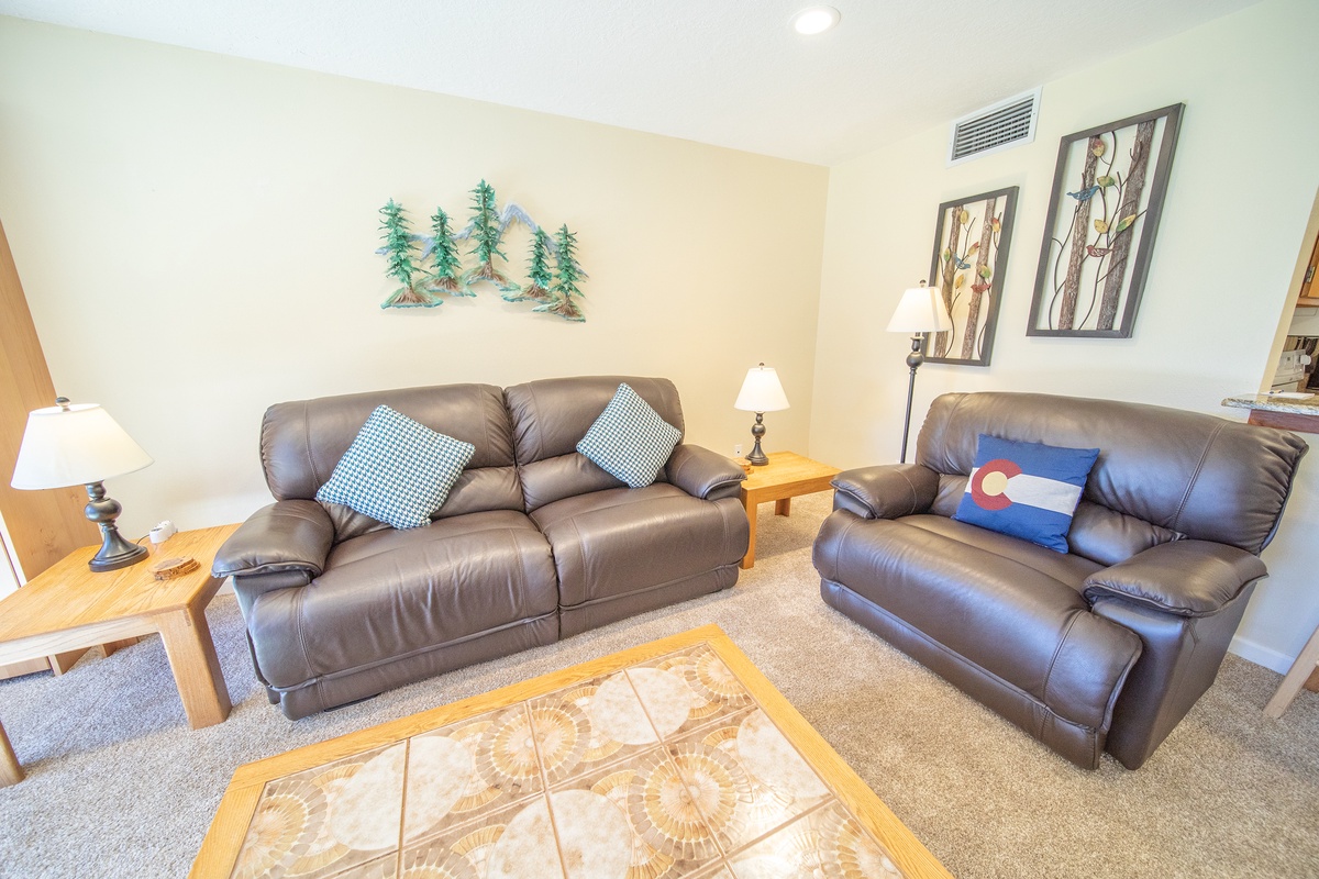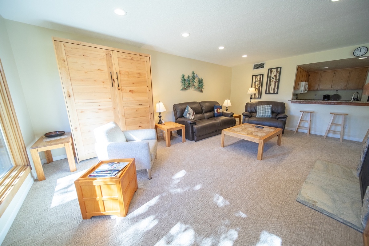 The living room area is tastefully decorated and features rustic furnishings, a gas fireplace, and a large flat-screen TV, making it the perfect spot to relax after a long day on the slopes. The fully equipped kitchen is just steps away, offering the option to cook your own meals and enjoy them together in the dining area. Step outside onto the private patio and soak up the breathtaking views of the Rocky Mountains.