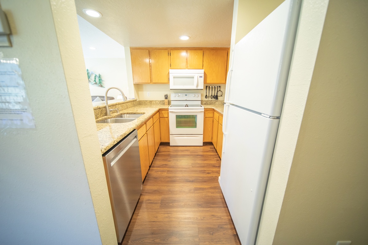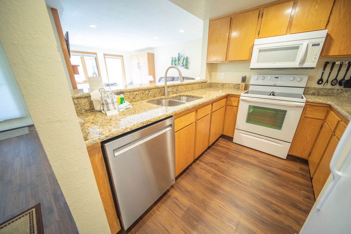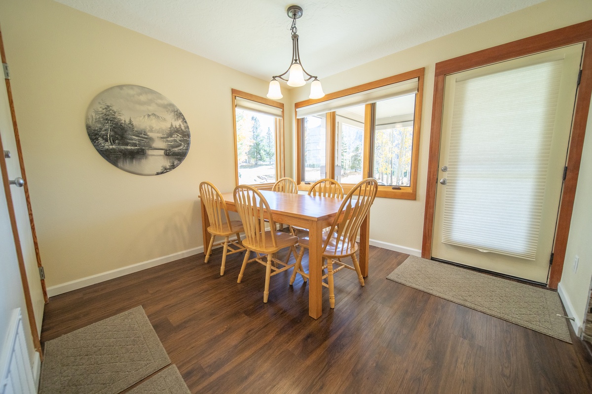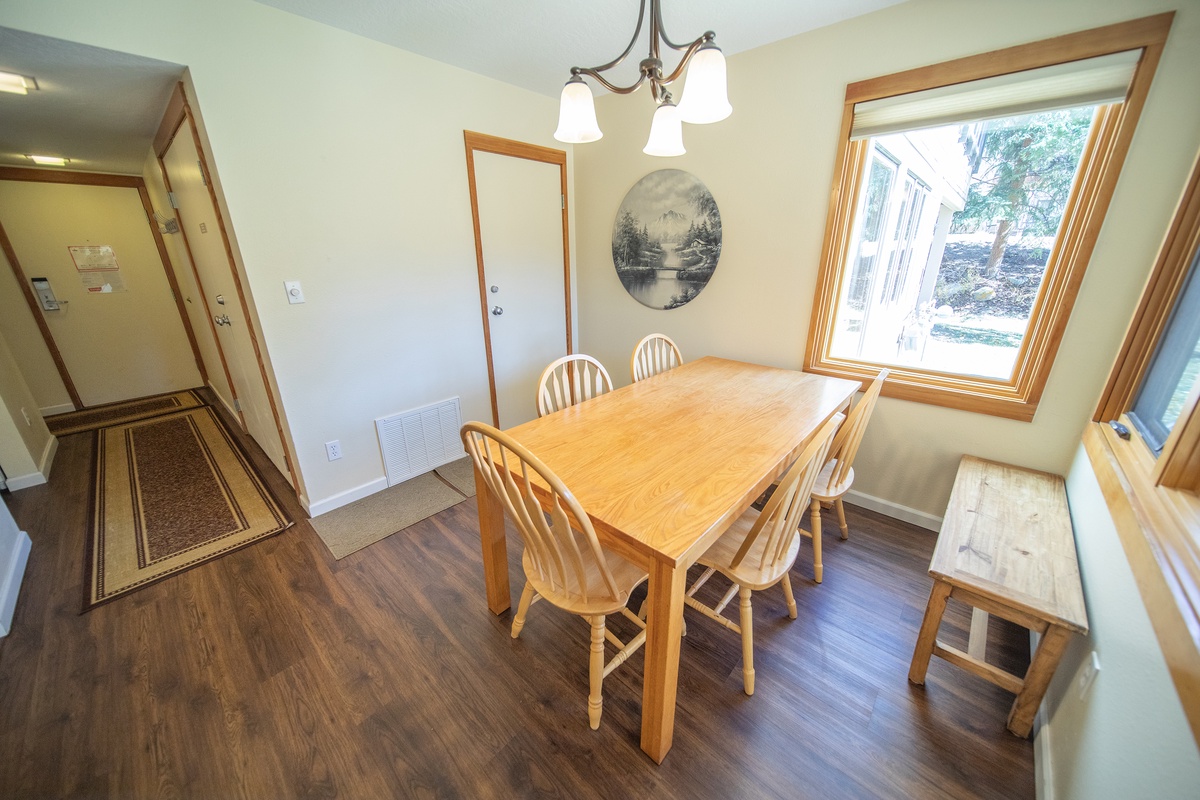 The living room area is tastefully decorated and features rustic furnishings, a gas fireplace, and a large flat-screen TV, making it the perfect spot to relax after a long day on the slopes. The fully equipped kitchen is just steps away, offering the option to cook your own meals and enjoy them together in the dining area. Step outside onto the private patio and soak up the breathtaking views of the Rocky Mountains.