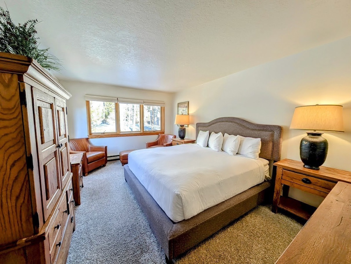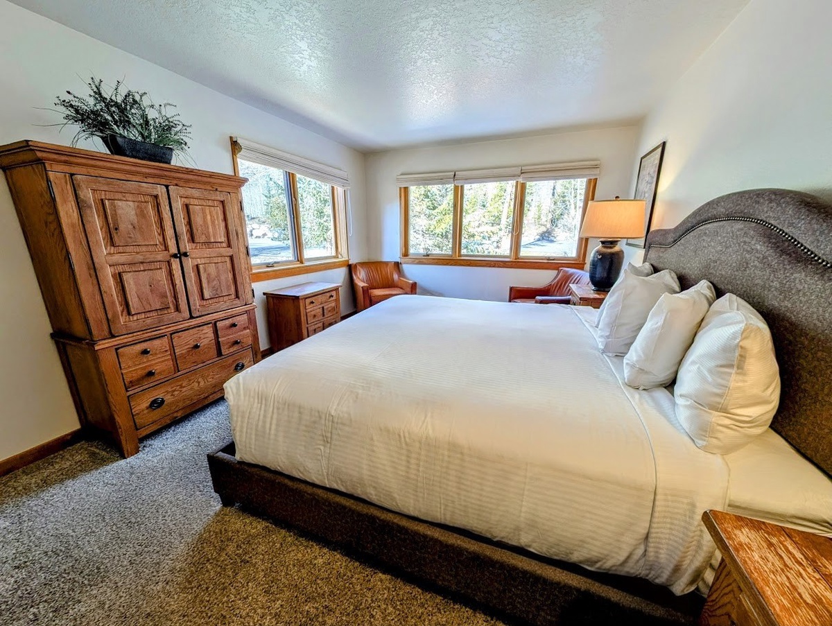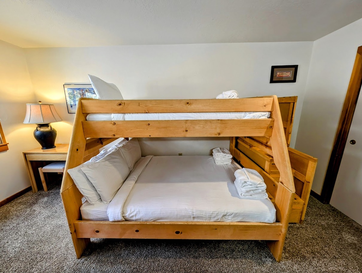 The large master bedroom features a comfortable bed and a private en-suite bathroom. The two other guest bedrooms have plenty of sleep options and are decorated with a mountain-inspired theme. The condo can comfortably accommodate up to 10 guests, making it perfect for families or couples traveling together.