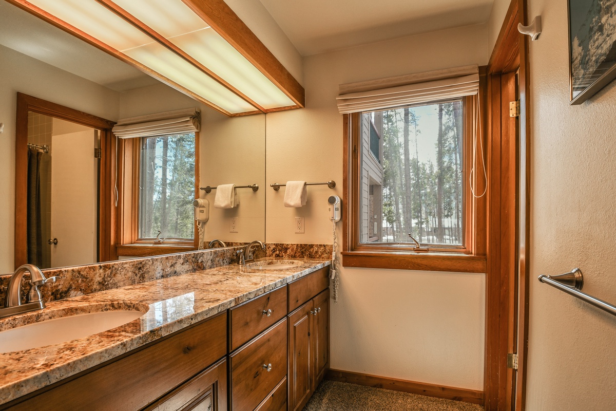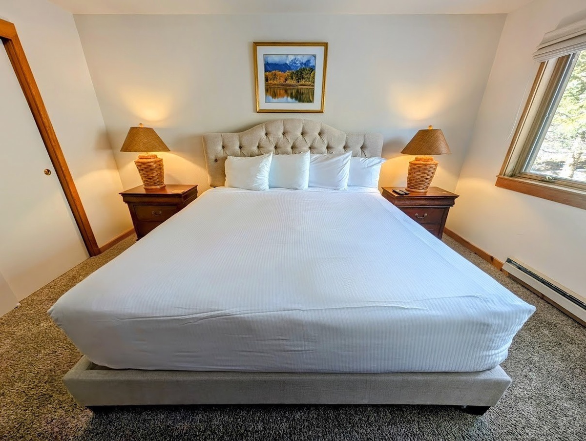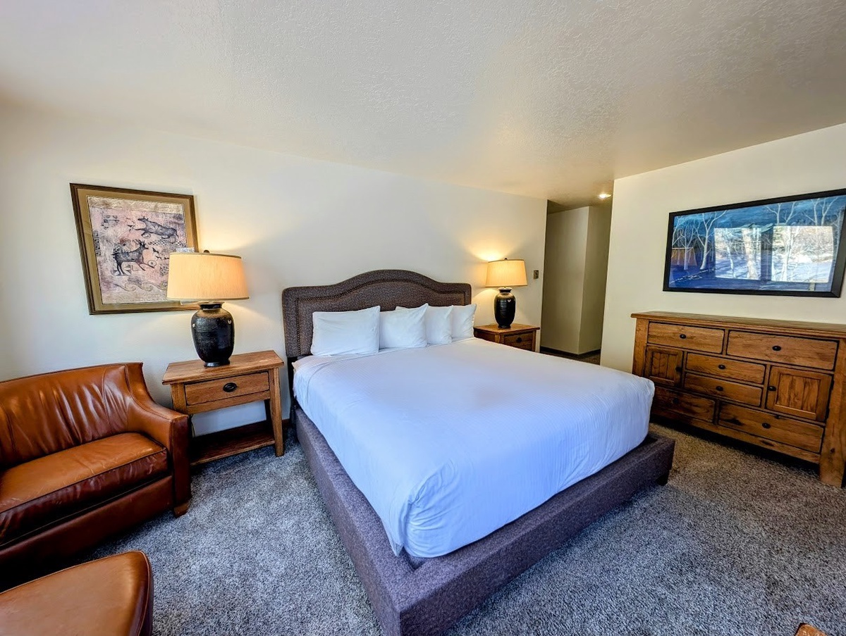 The large master bedroom features a comfortable bed and a private en-suite bathroom. The two other guest bedrooms have plenty of sleep options and are decorated with a mountain-inspired theme. The condo can comfortably accommodate up to 10 guests, making it perfect for families or couples traveling together.