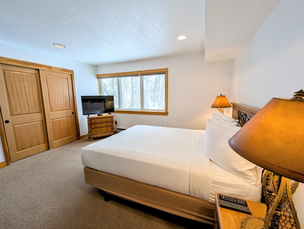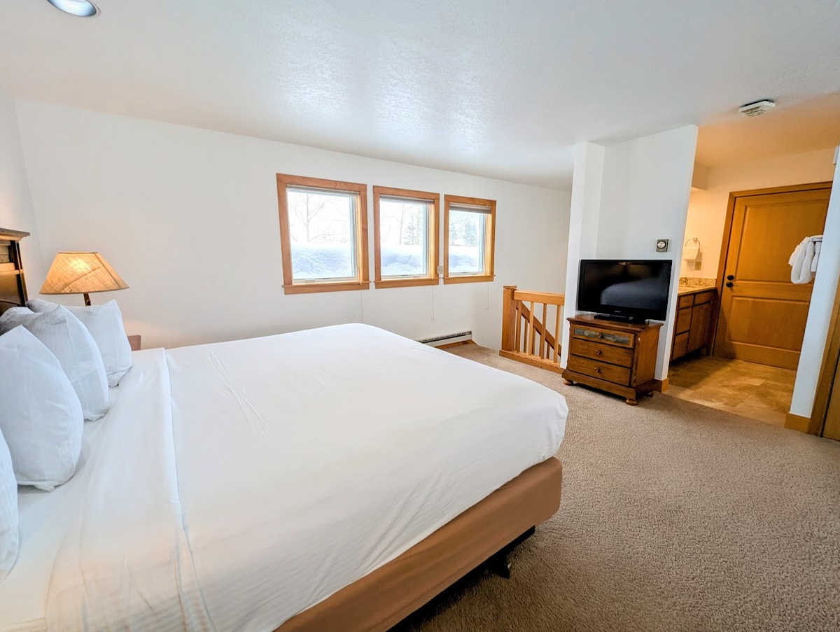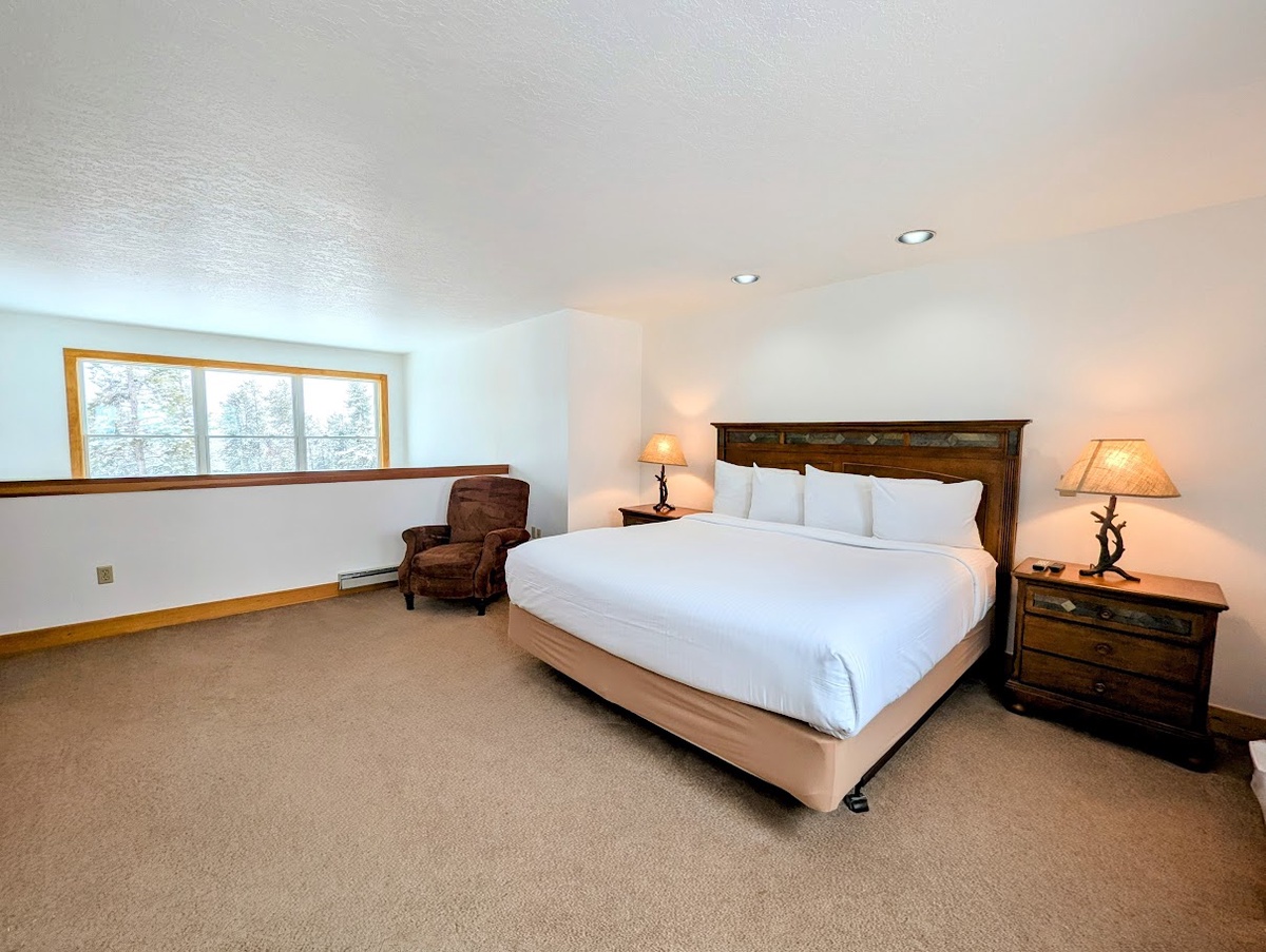 The ensuite loft bedroom is spacious and cozy, designed to ensure a restful night's sleep. The downstairs guests bedroom is also a large bedroom with natural light. Plush bedding, ample storage, and mountain-inspired decor create a peaceful retreat for every guest. The two large bathrooms feature modern fixtures and plenty of space to unwind and refresh.
