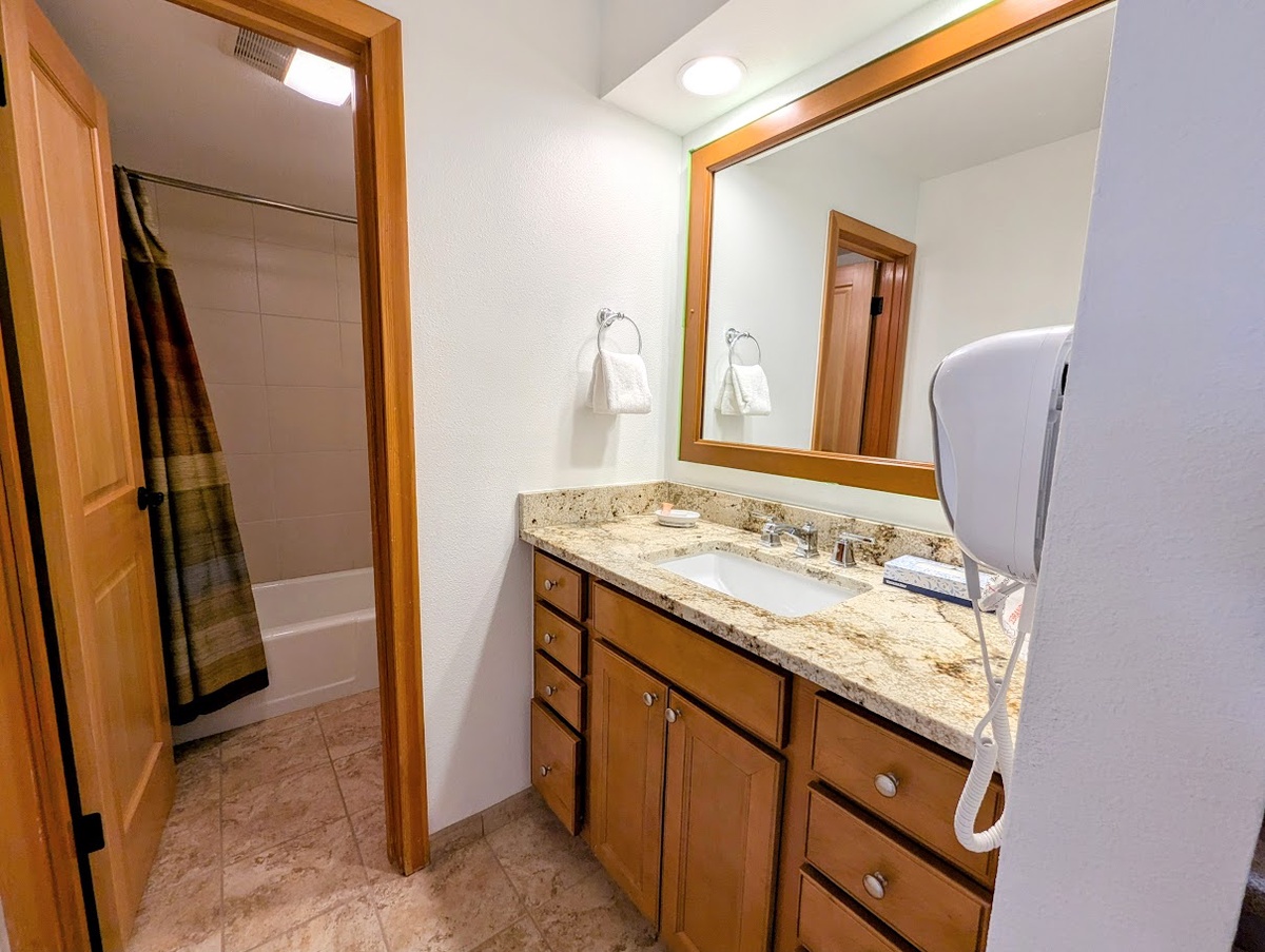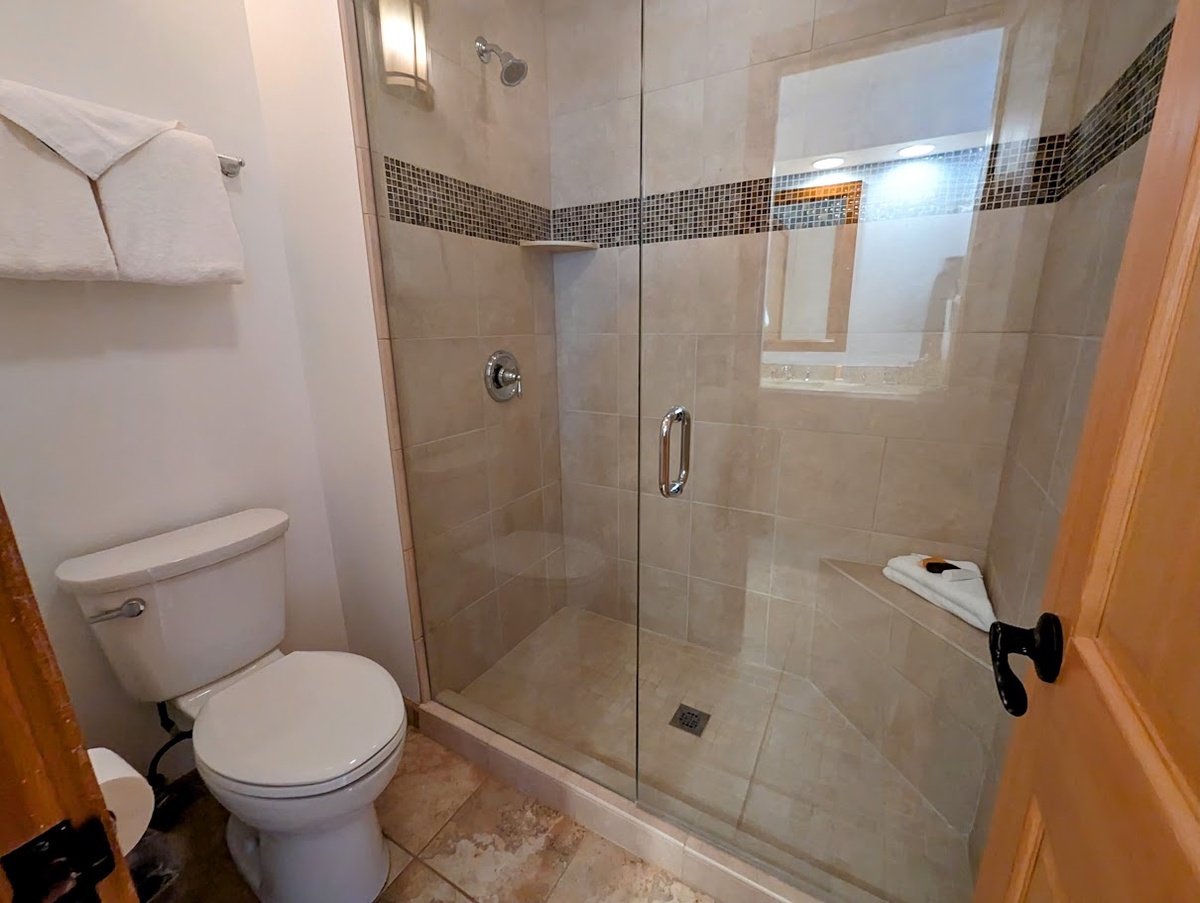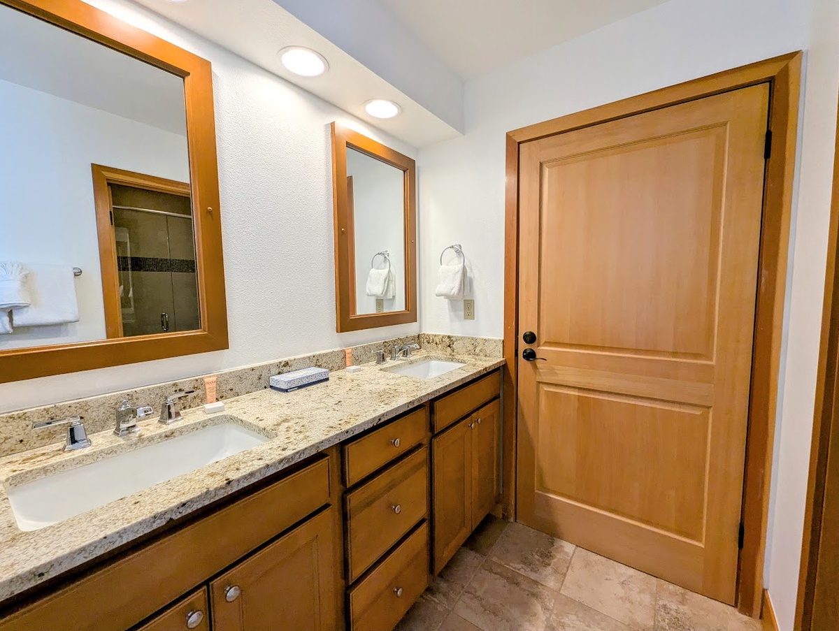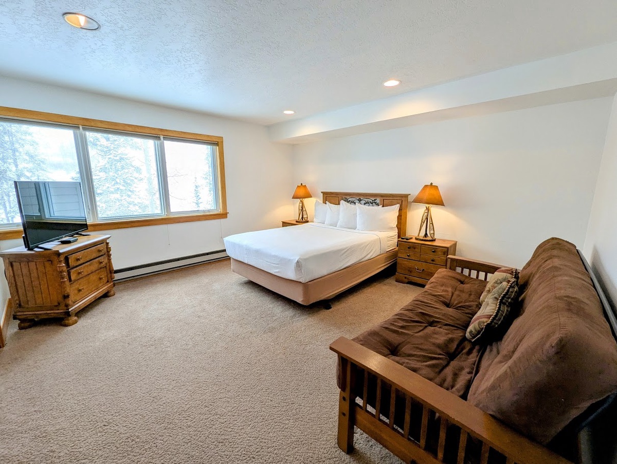 The ensuite loft bedroom is spacious and cozy, designed to ensure a restful night's sleep. The downstairs guests bedroom is also a large bedroom with natural light. Plush bedding, ample storage, and mountain-inspired decor create a peaceful retreat for every guest. The two large bathrooms feature modern fixtures and plenty of space to unwind and refresh.