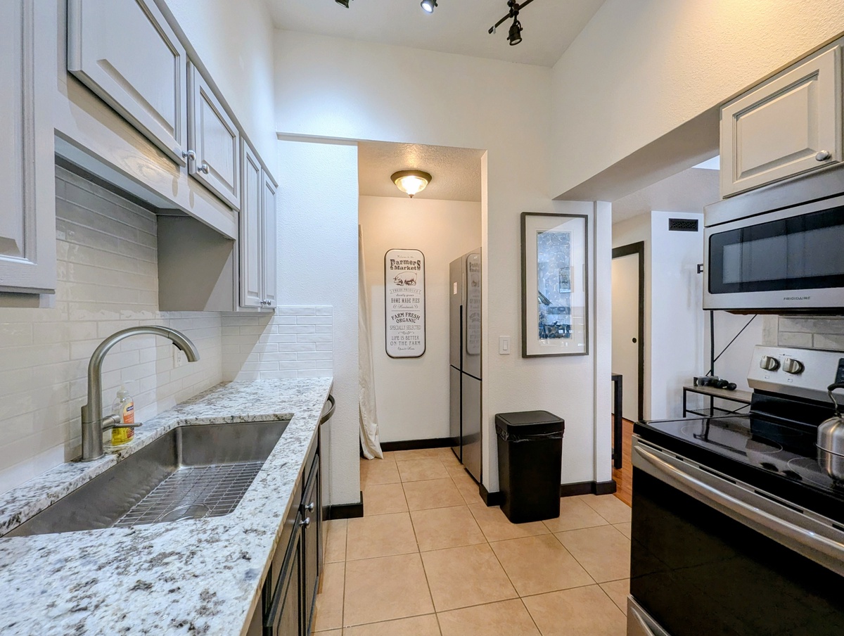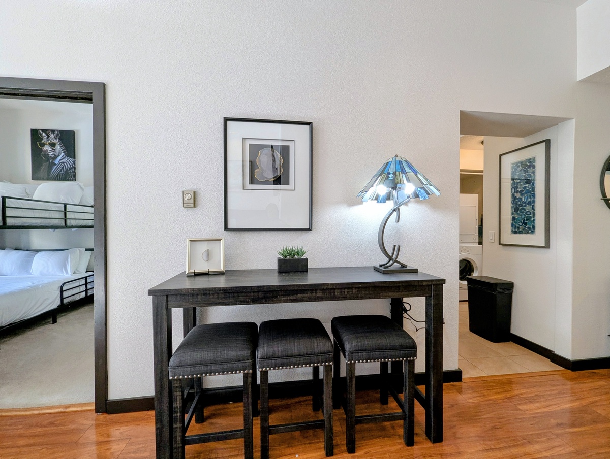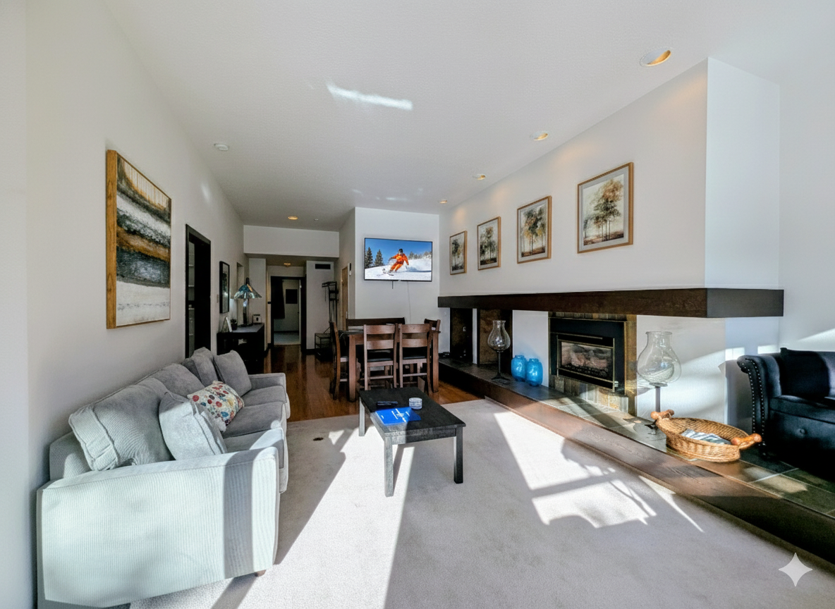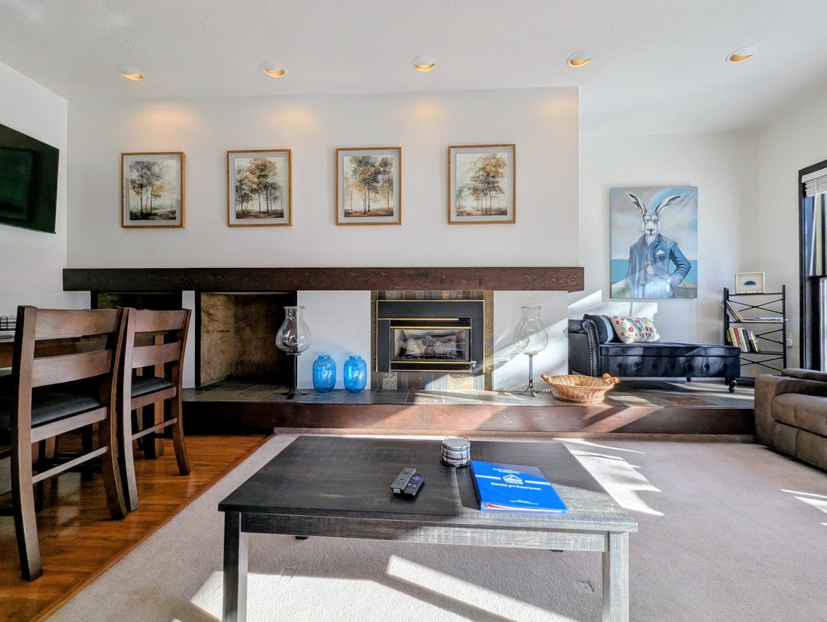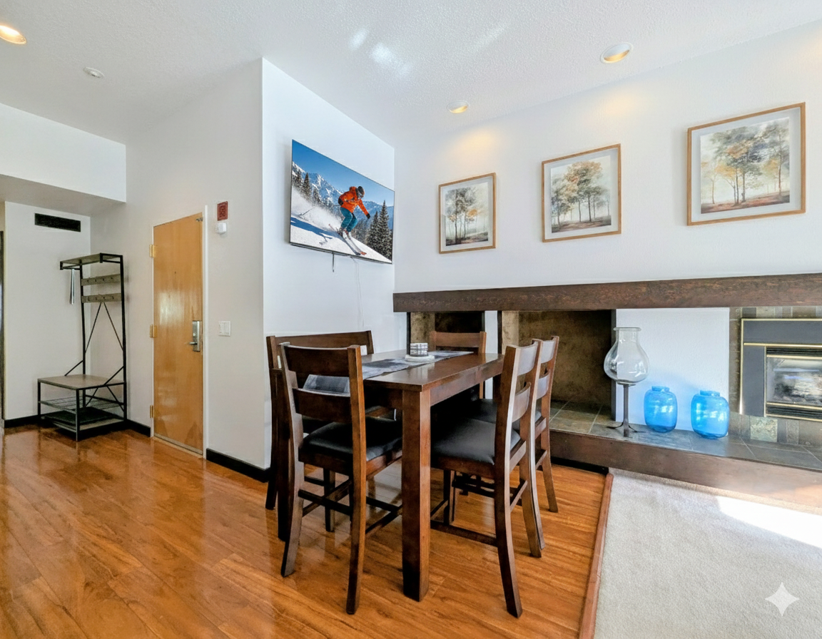 The fully equipped updated kitchen makes meals easy and enjoyable, offering ample counter space and everything needed to prepare hearty breakfasts or après-ski dinners. Adjacent dining space allows everyone to gather together, share stories from the day, and plan tomorrow’s adventures. The condo’s efficient layout ensures the space feels open while still offering privacy when needed.