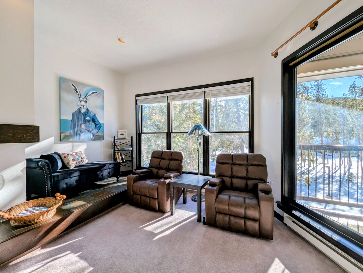 The open living area welcomes you after a day of adventure with cozy seating, natural light, and mountain-inspired décor that sets the tone for relaxation. Large windows frame scenic surroundings, creating a bright and airy atmosphere year-round. Whether you’re enjoying a quiet morning coffee or winding down in the evening, the living space is designed for connection and comfort.