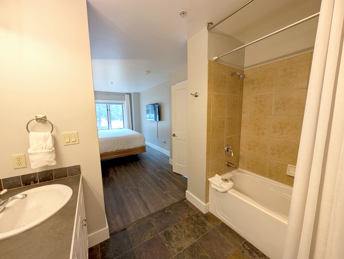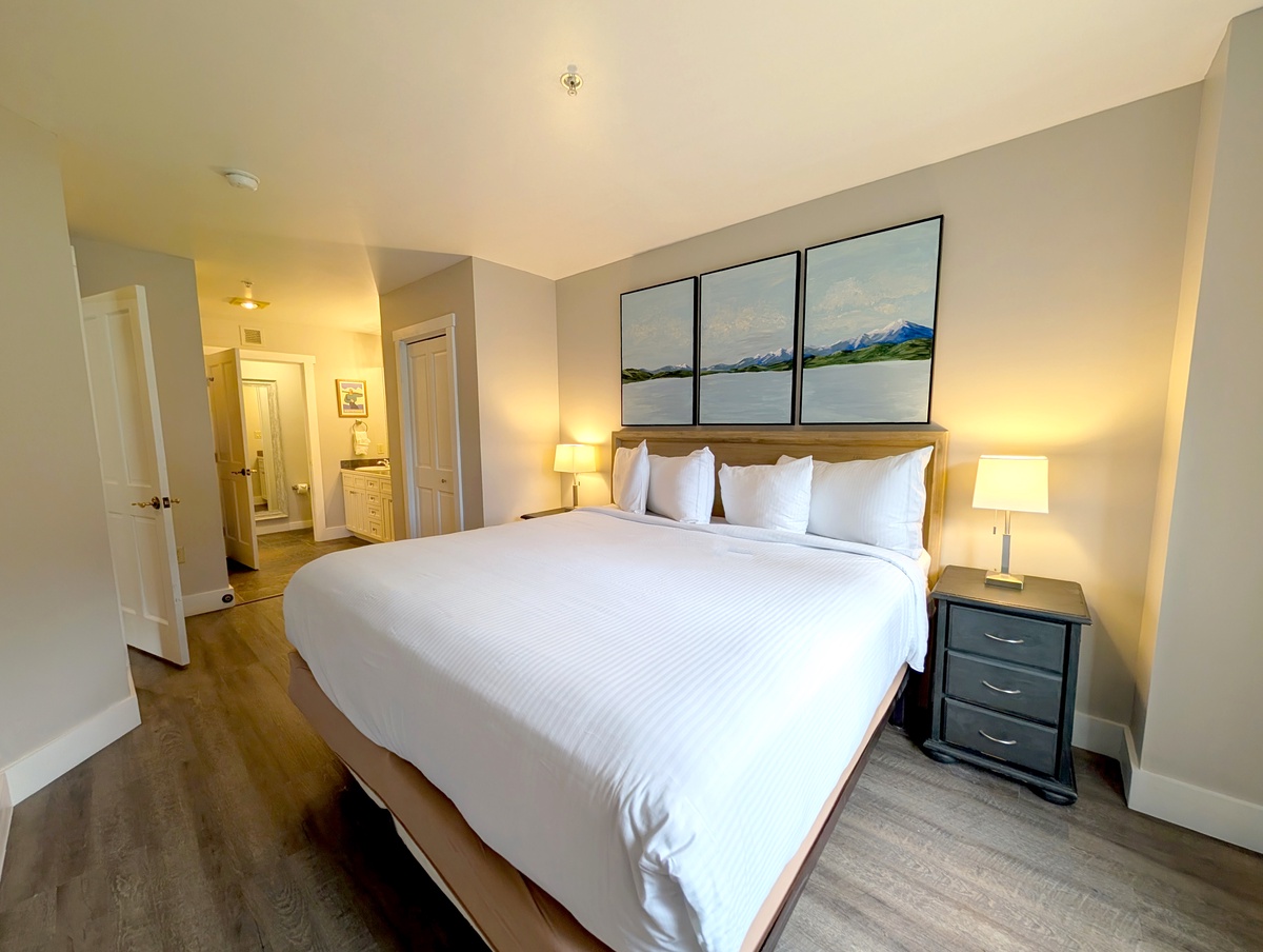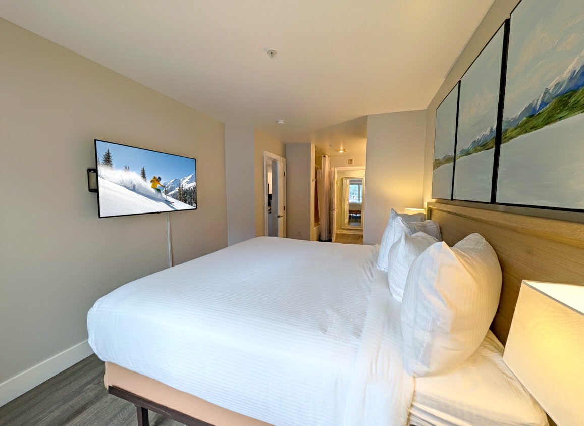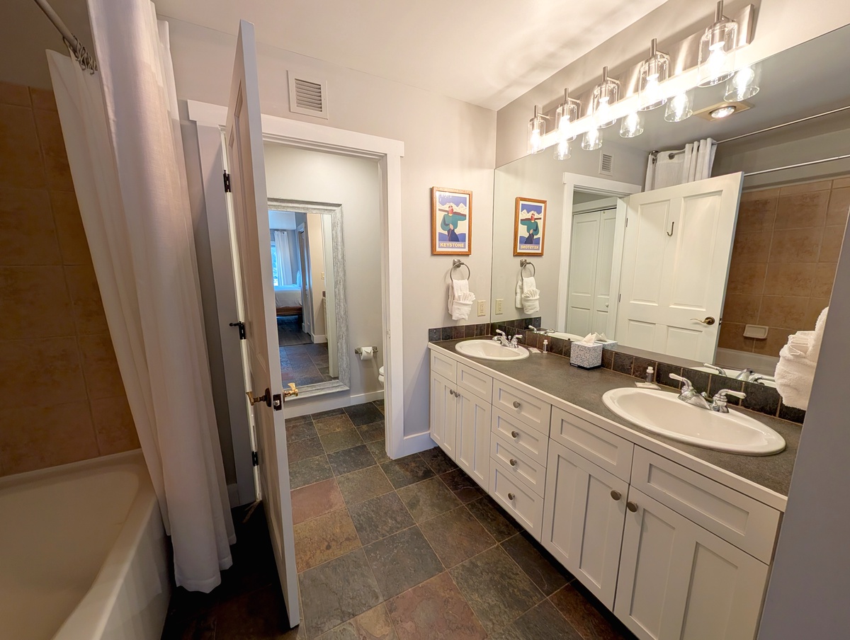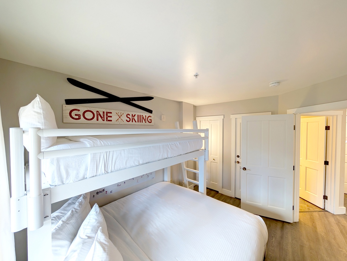 Each of the two beautifully furnished bedrooms invites tranquility and relaxation. Bright, airy, and thoughtfully designed, these rooms are adorned with modern décor, natural wood finishes, and plush, comfortable beds. Large windows in each room frame the majestic mountain views and invite the Colorado sunshine in, providing the perfect serene retreat. Two inviting bathrooms, featuring spacious layouts, and high-quality fixtures, ensure privacy and convenience for all guests.