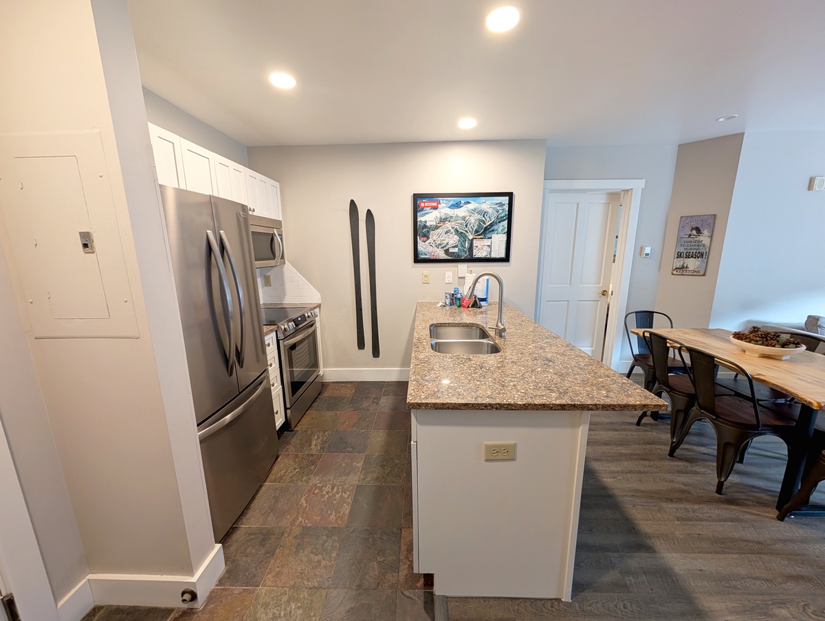 No detail is overlooked in the full-sized kitchen, equipped with modern appliances, extensive countertop space, and a generous breakfast bar. Whether you're brewing a morning cup of coffee or creating a hearty meal after a day on the slopes, you'll find all the essentials at your fingertips. The dining area, with a stylish table set against a stunning backdrop of panoramic windows, offers an ambiance that turns every meal into a special occasion.