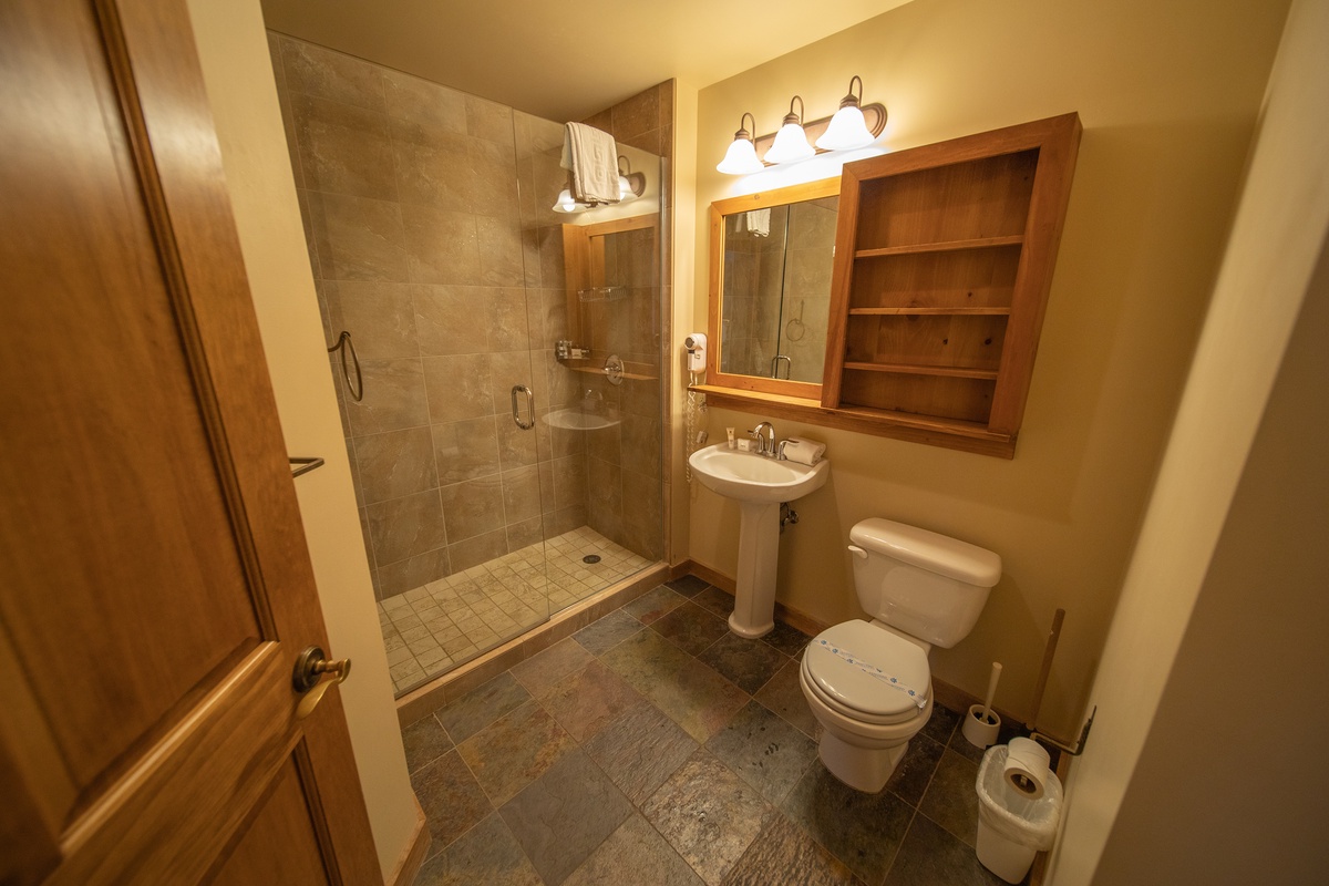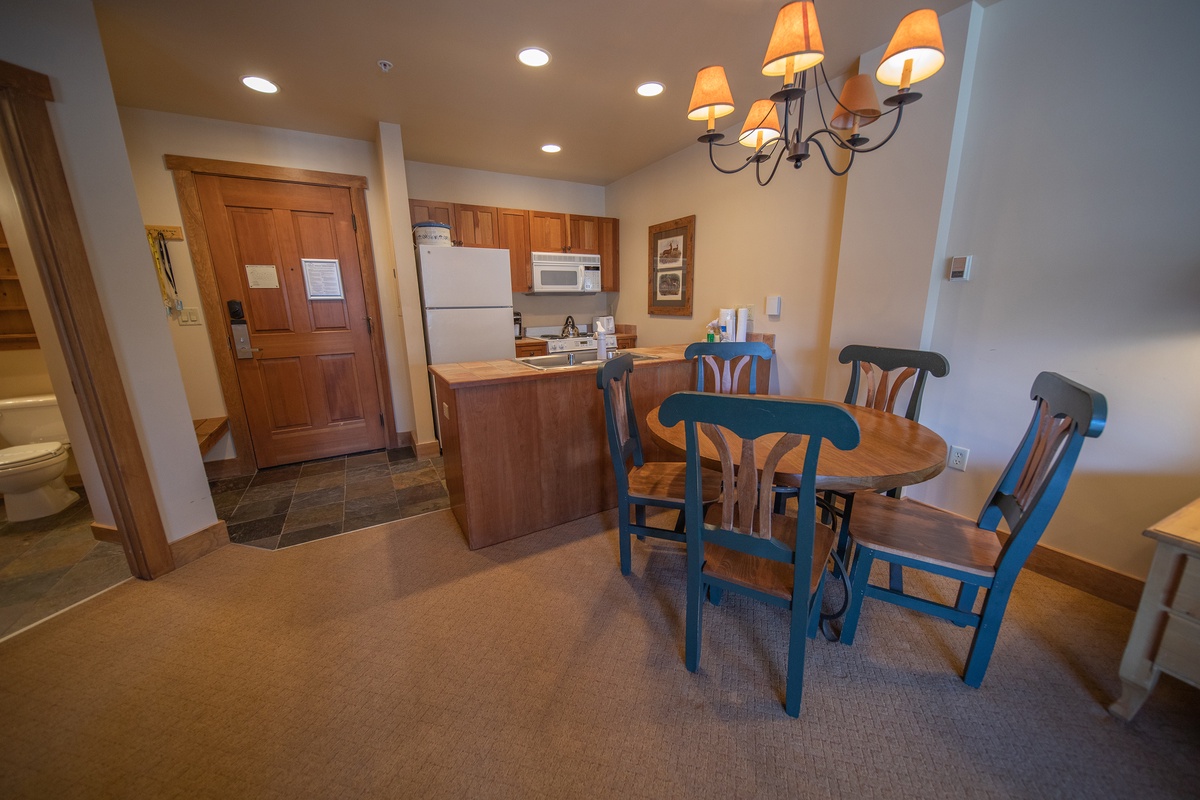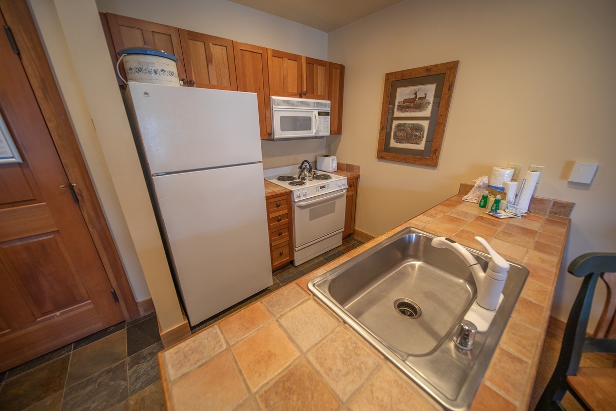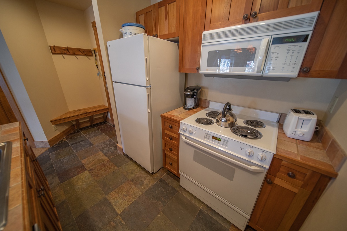 The kitchen continues this condo's story of comfort and functionality. Fully equipped with modern appliances and tile countertops, it provides a fantastic setting for whipping up breakfast before hitting the slopes or preparing a hearty meal to enjoy at the dining table as you wind down for the evening.