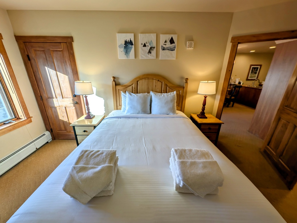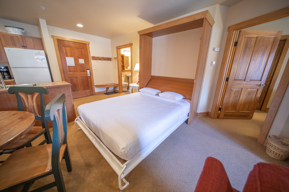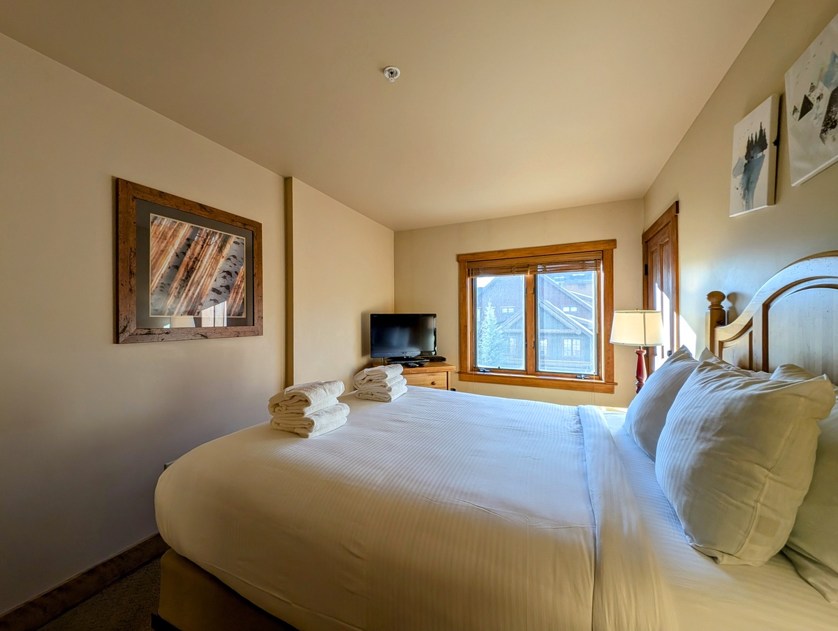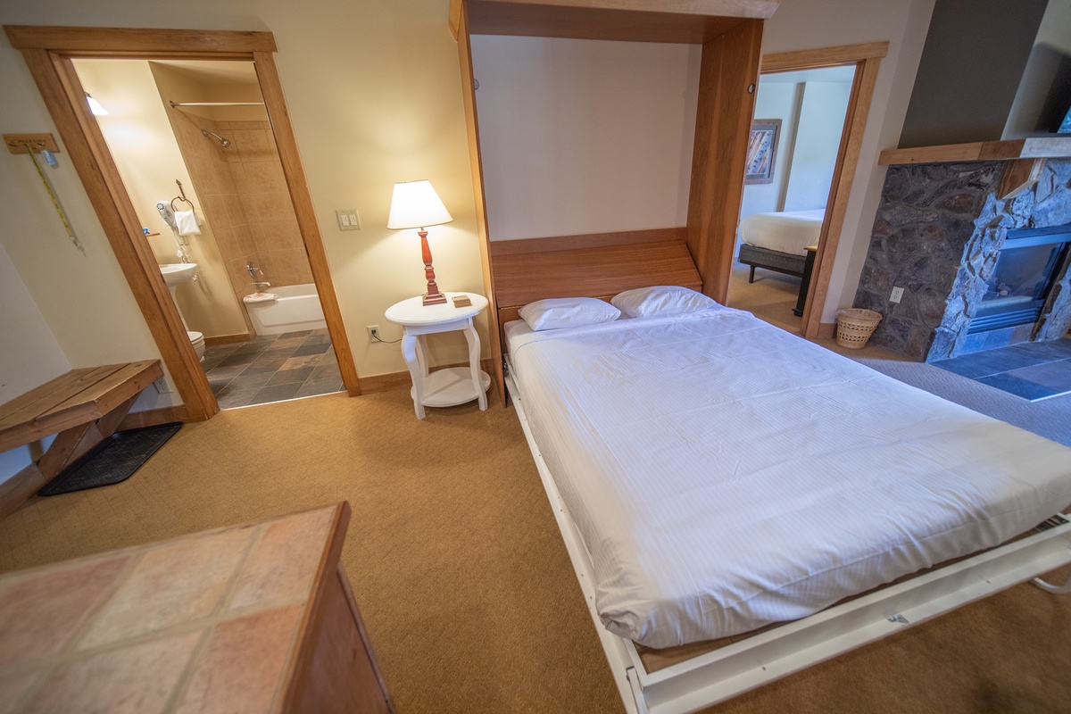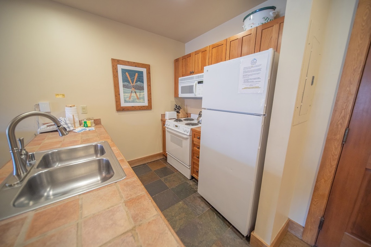 As you enter the condo, your eyes will be drawn to the stylishly decorated living room. Plush seating, modern artwork, and a cozy gas fireplace create a warm, inviting atmosphere where you can unwind after a day of skiing. An inviting fully equipped kitchen is ready to assist in whipping up your favorite meals. Each space has been thoughtfully designed to offer all the comforts of home.