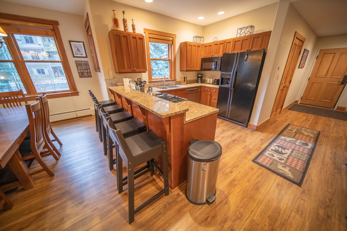 Our welcoming living area is designed to inspire relaxation and convivial moments. Sink into the plush sofa and chairs, feel the heat radiate from the stone fireplace, and enjoy the entertainment center. An open-concept layout allows for easy flow between spaces, fostering an inviting atmosphere for gathering and entertaining. The gourmet kitchen, equipped with modern appliances and gleaming granite countertops, is sure to ignite your culinary creativity. The elegant dining area accommodates your party comfortably, inviting you to savor delicious meals against the backdrop of the glorious Colorado Rockies.