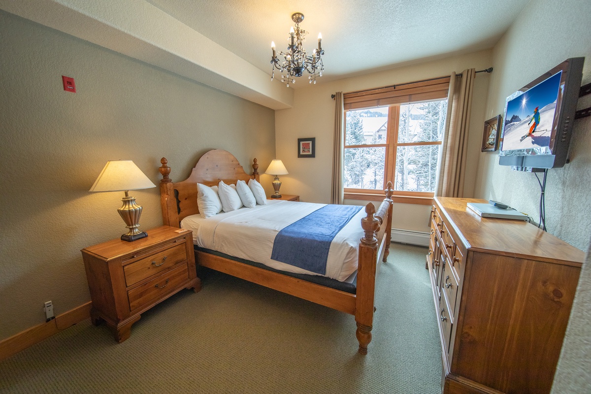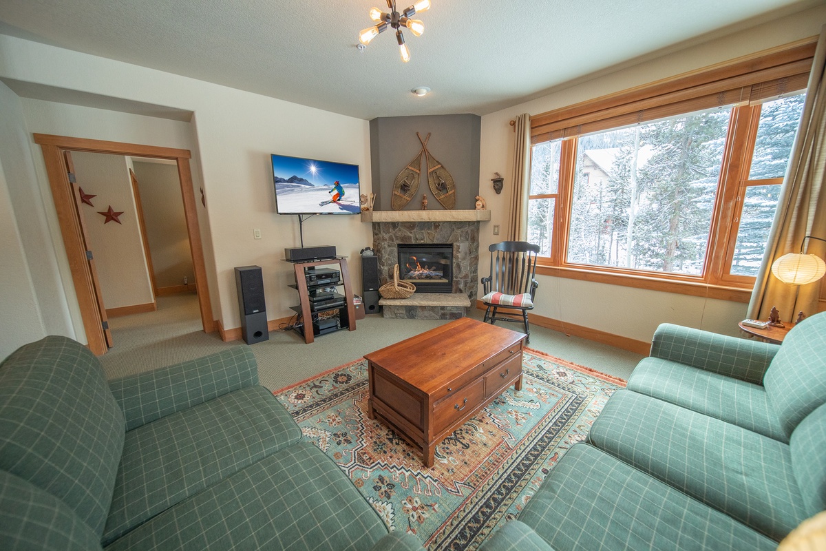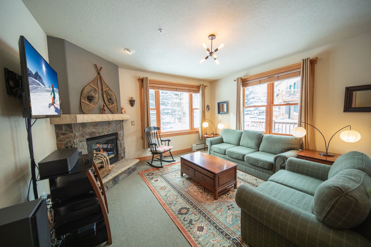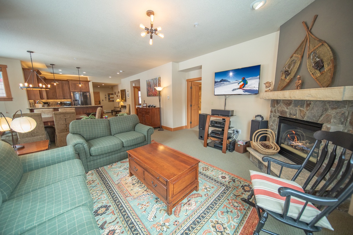 Step into the open-concept living area, with new and tastful furnishings. Where a cozy couch invites you to lounge in front of the stone fireplace. Sink into its softness and warm up after a day on the slopes, as you indulge in the high-definition entertainment system. The living room opens onto a private balcony, the ideal perch for taking in the crisp mountain air and scenic views of Keystone's splendid landscapes.