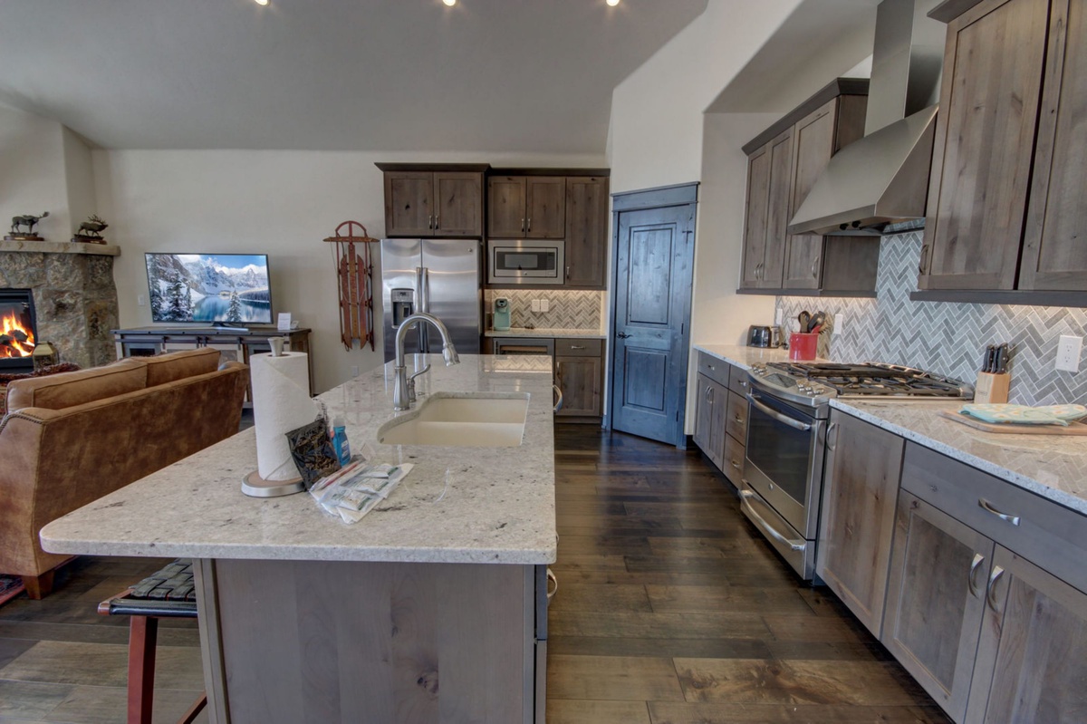 The spacious living area, washed in natural light, invites you to unwind. Sink into the plush sofas, warmed by the glow of the fireplace and enjoy movie nights with the family. The fully equipped kitchen, complete with modern stainless-steel appliances and sleek granite countertops, is a culinary enthusiast's delight. Whether you're preparing a hearty breakfast before hitting the slopes or an intimate dinner after a day of exploring, this space will inspire your inner chef.