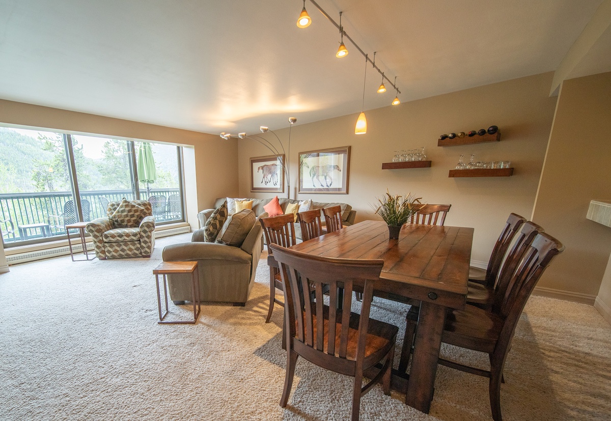 Inside, you’ll find an open living area with a gas fireplace and plenty of seating—great for relaxing after a day outdoors. Large windows bring in natural light and showcase the mountain scenery. The dining area sits next to a fully equipped kitchen with ample counter space and everything you need for preparing meals.