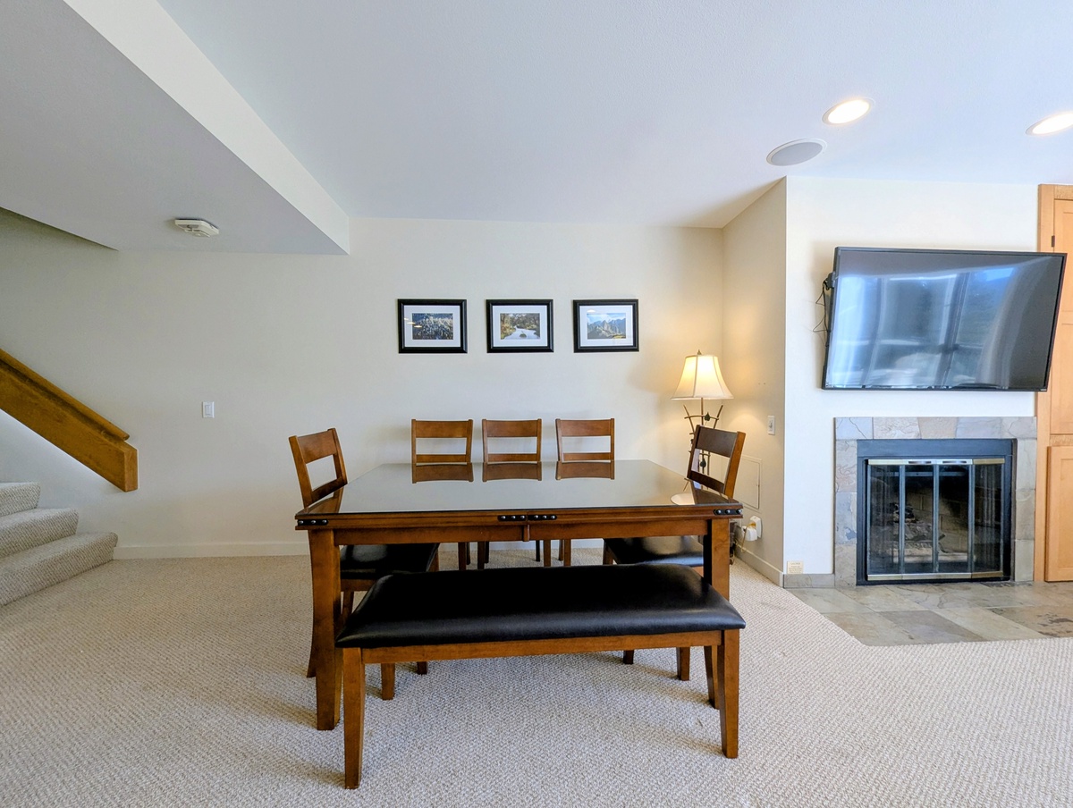 The living space is designed for both comfort and entertainment, featuring an open-concept layout that seamlessly connects the living room, dining area, and kitchen. The living room invites you to unwind after a day on the slopes with plush seating, a large flat-screen TV, and a fireplace that adds a touch of alpine coziness. The fully equipped kitchen makes meal preparation effortless, complete with modern appliances, ample counter space, and everything needed to craft everything from quick breakfasts to gourmet dinners. Gather around the dining table for meals or enjoy a morning coffee while taking in the stunning mountain views.