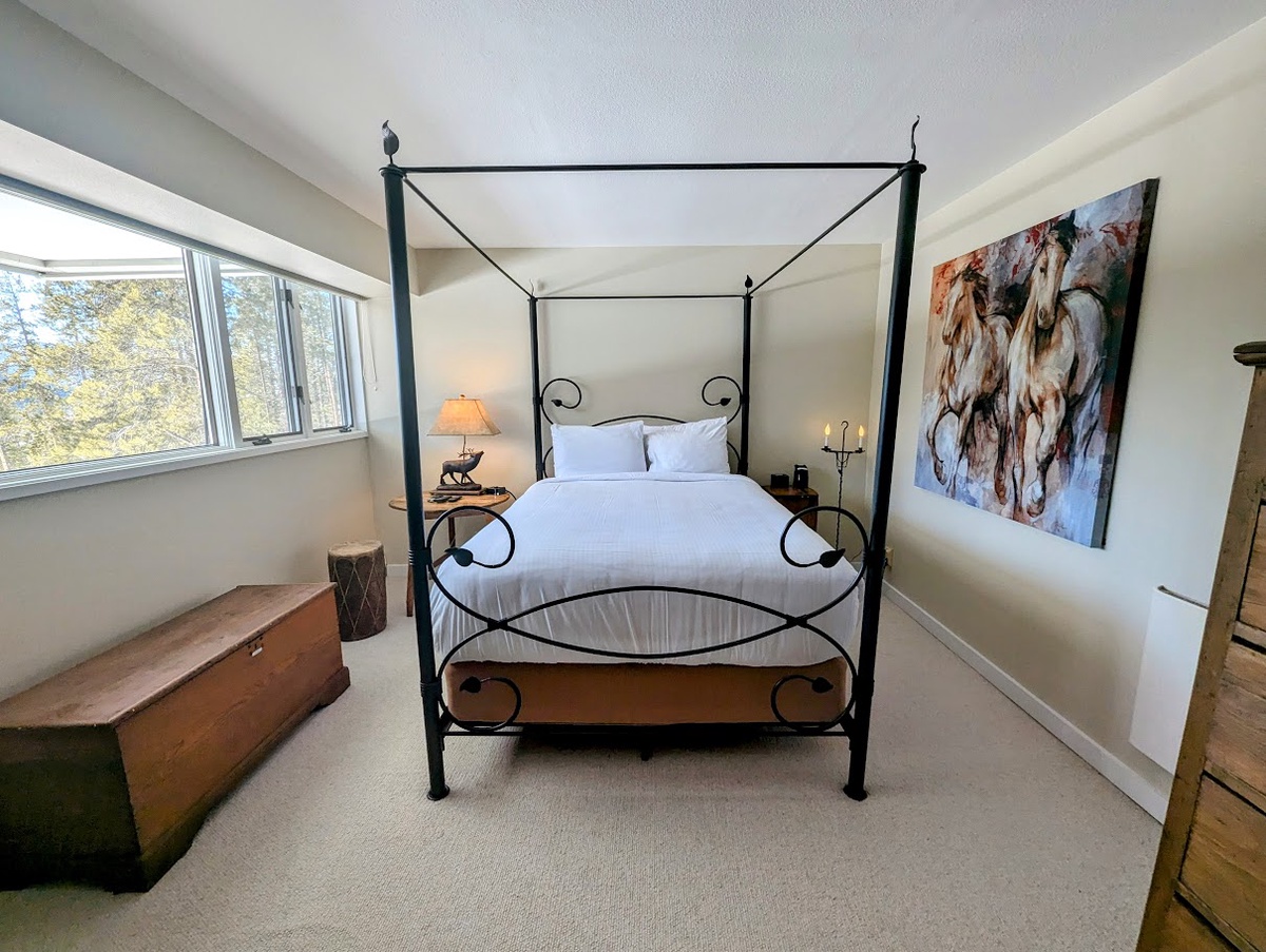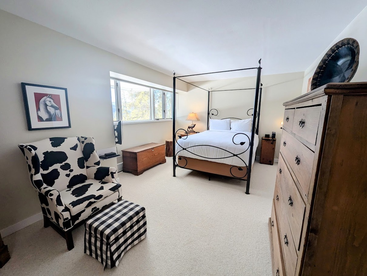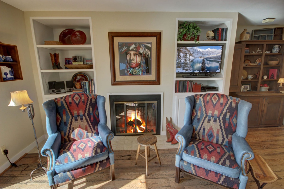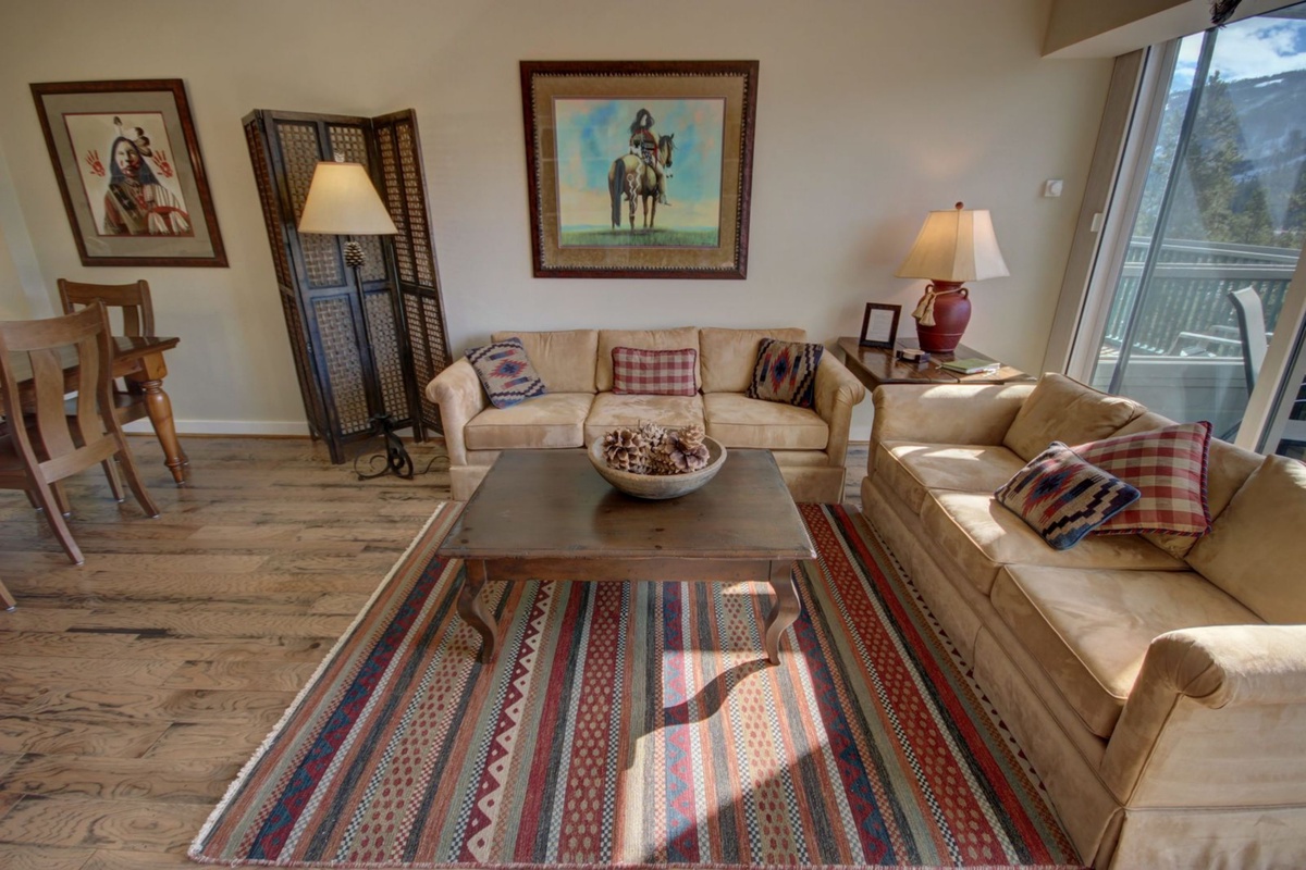 The stylish interiors of the condo are tailored to make you feel at home, from the modern furniture to the carefully curated artwork, every detail has been considered to elevate your stay. The well-appointed living room features comfortable sofas, a flat-screen TV, and a cozy gas fireplace. From the living room, you can access the balcony directly, where you will be greeted by stunning mountain views.