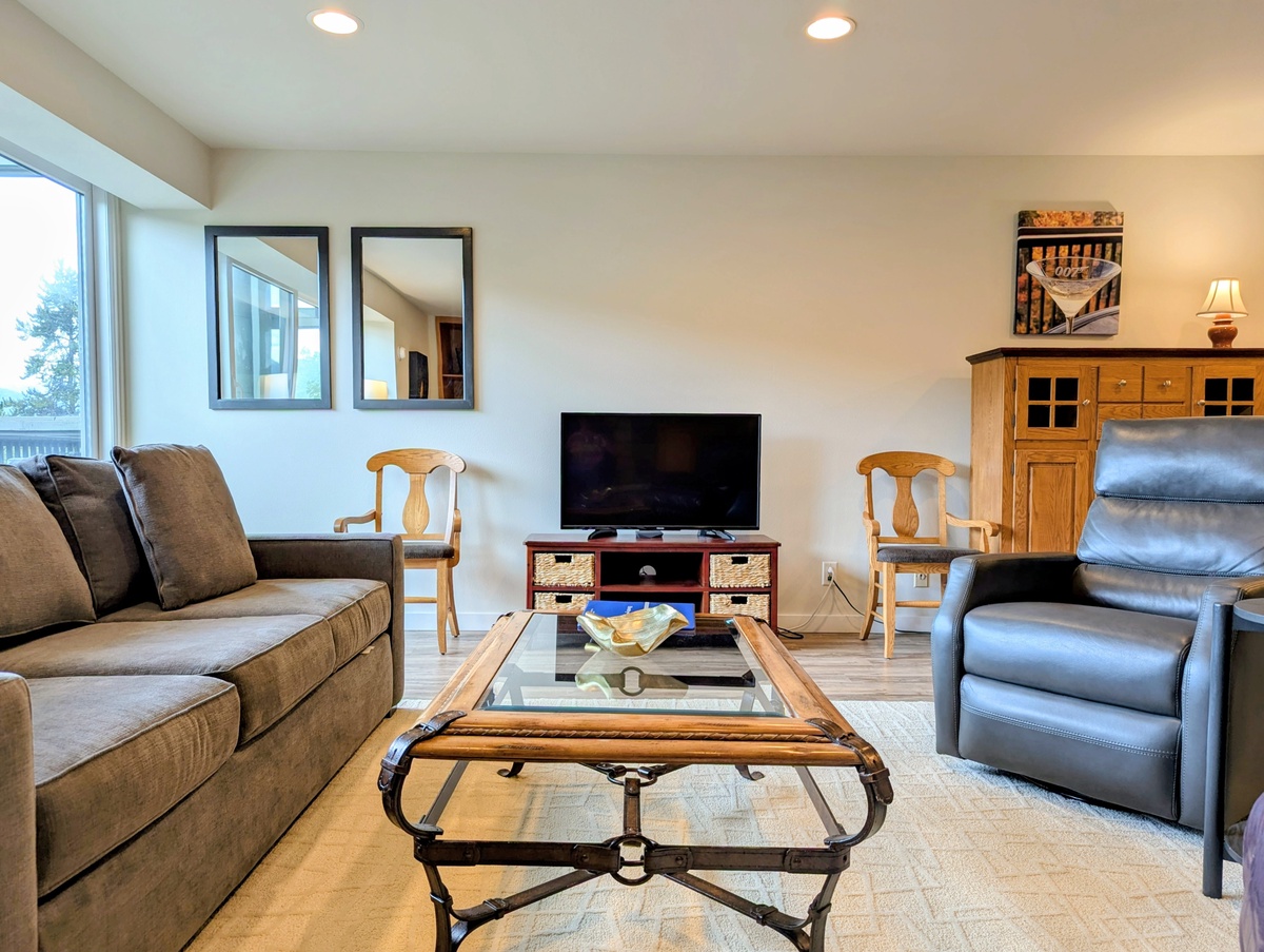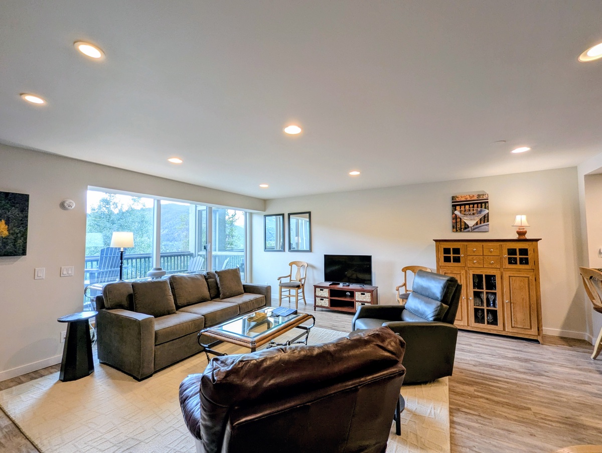 Step inside and you’ll find a warm and welcoming living space designed with relaxation in mind. Large windows let in plenty of natural light and showcase the stunning mountain views, while a cozy fireplace anchors the living room for gathering after a day outdoors. Thoughtful mountain décor and modern finishes create a space that feels both stylish and comfortable.