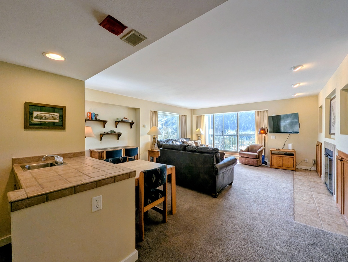 Step inside to discover a warm and inviting open-concept living area, featuring rich wood accents, and large windows that fill the space with natural light and forest views. The gas fireplace adds to the mountain charm, providing a cozy focal point for relaxing after a day of skiing or hiking. The spacious private balcony offers the perfect spot to enjoy morning coffee or unwind with a glass of wine as the sun sets behind the pines.
