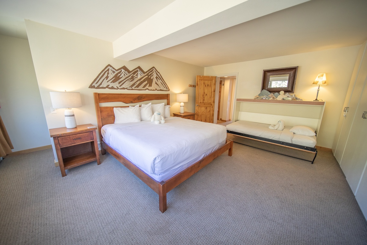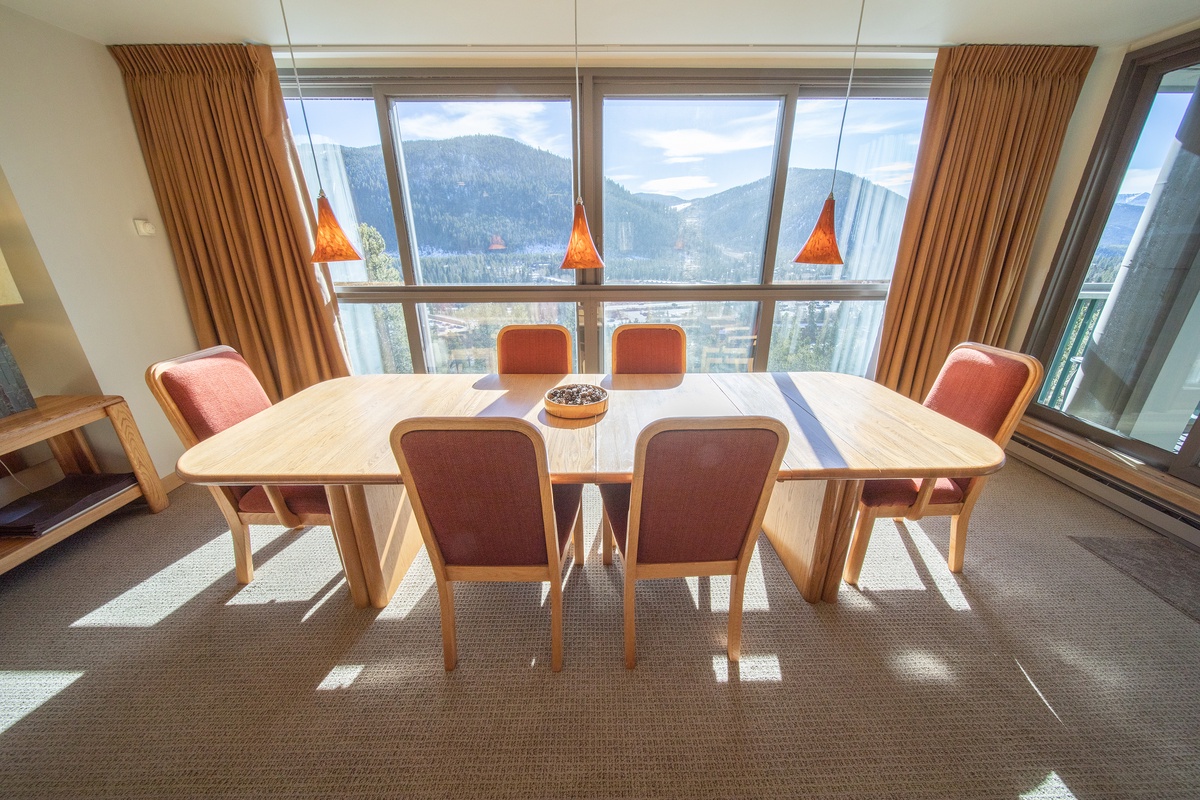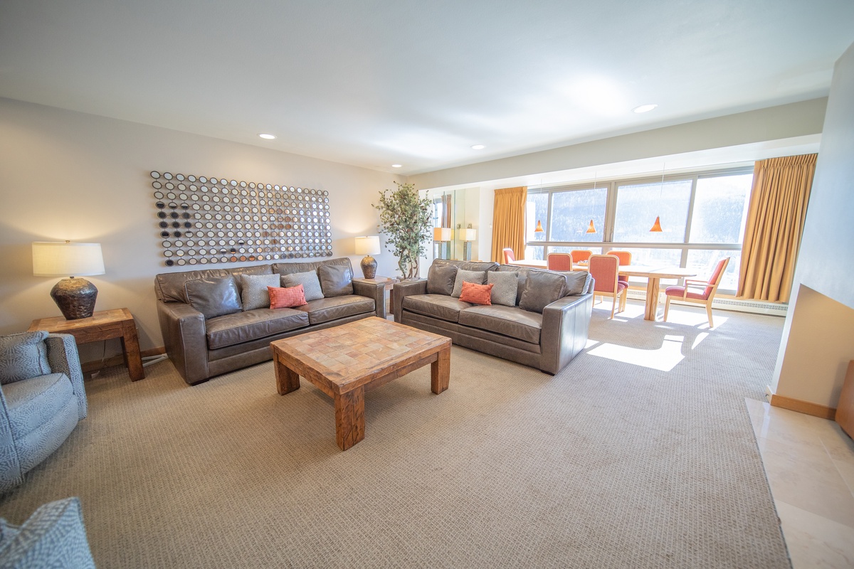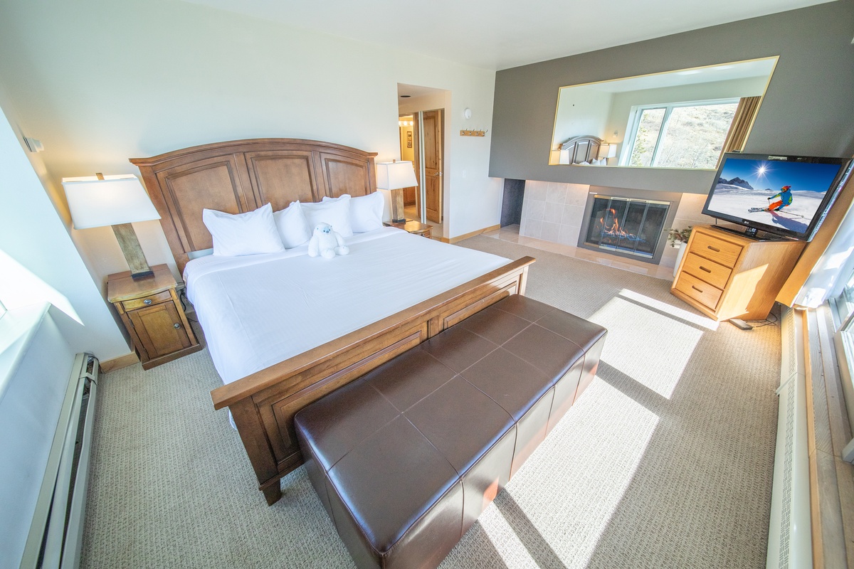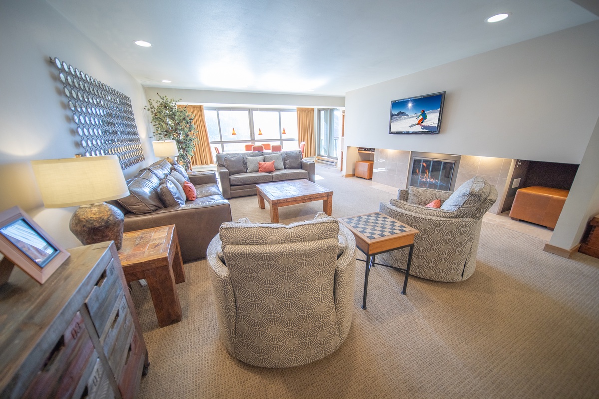 The Master bedroom is a highlight, featuring a private fireplace and balcony access, offering awe-inspiring views. The Guest bedroom also impresses with ample storage and sleeping arrangements for three. A Den/Bonus Room provides additional sleeping space and lounging area, ensuring plenty of room for your group to relax in this spacious vacation condo.