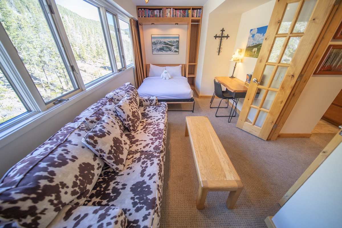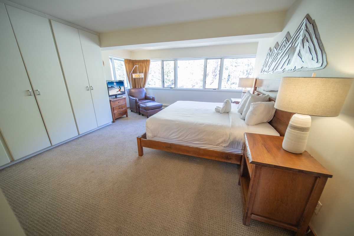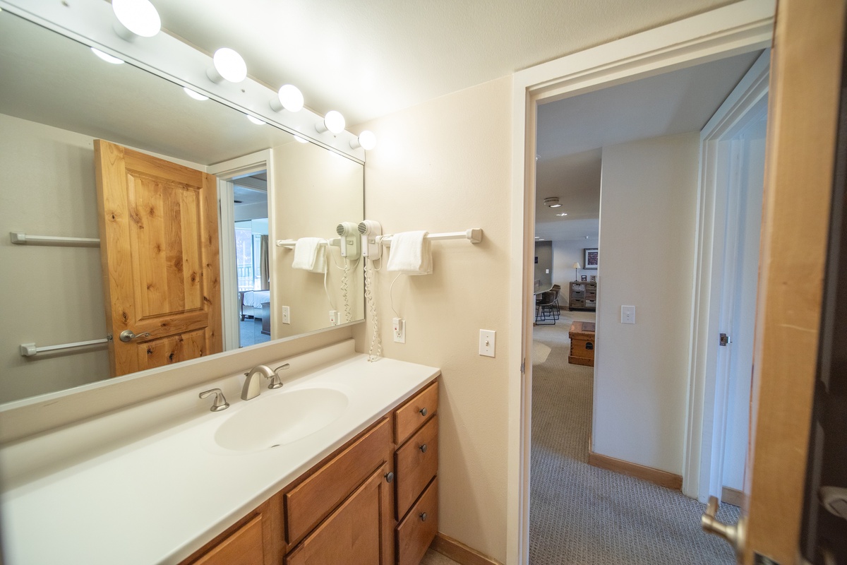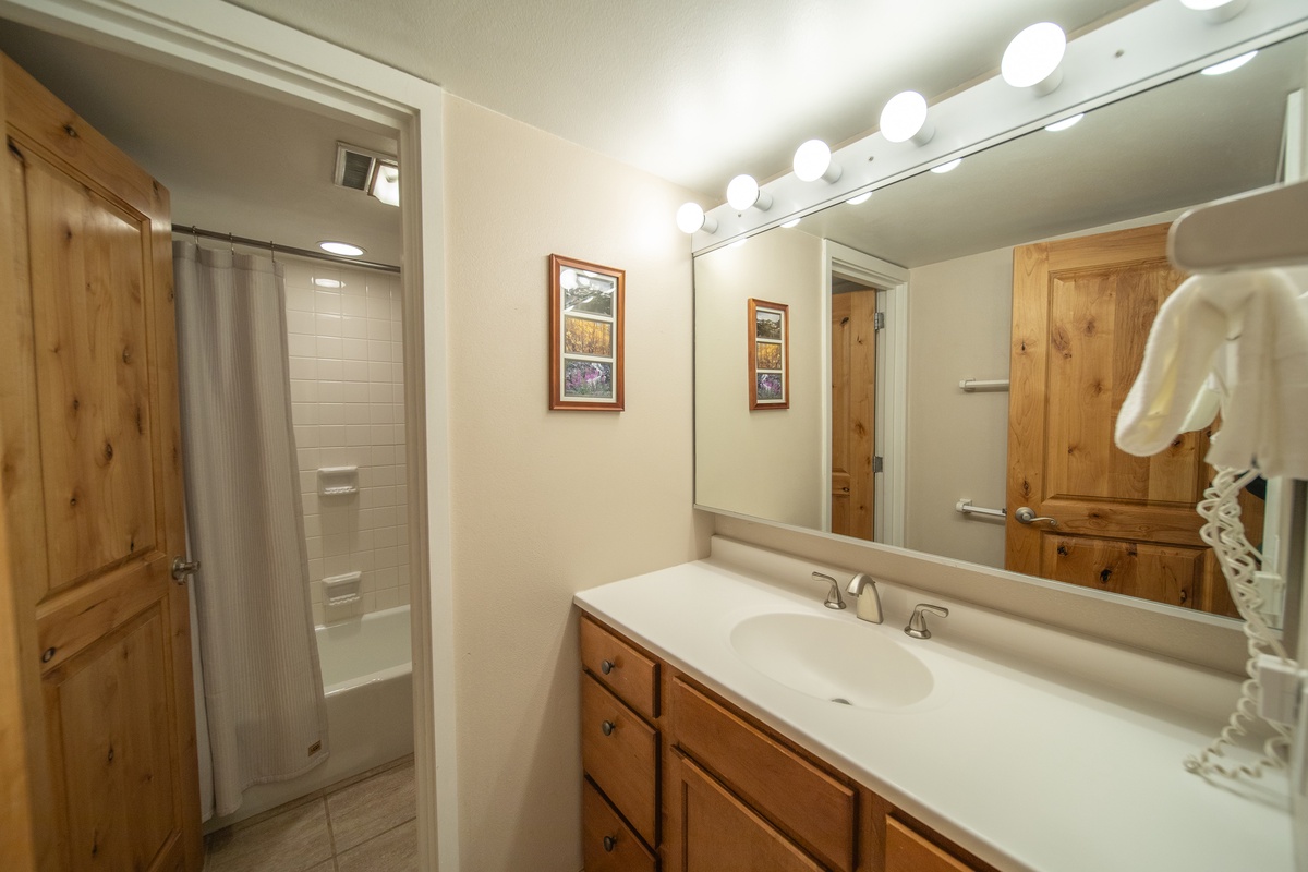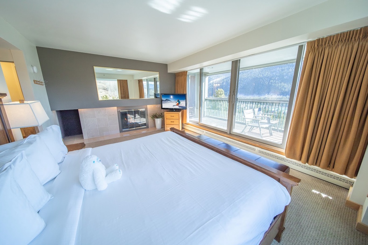 The Master bedroom is a highlight, featuring a private fireplace and balcony access, offering awe-inspiring views. The Guest bedroom also impresses with ample storage and sleeping arrangements for three. A Den/Bonus Room provides additional sleeping space and lounging area, ensuring plenty of room for your group to relax in this spacious vacation condo.