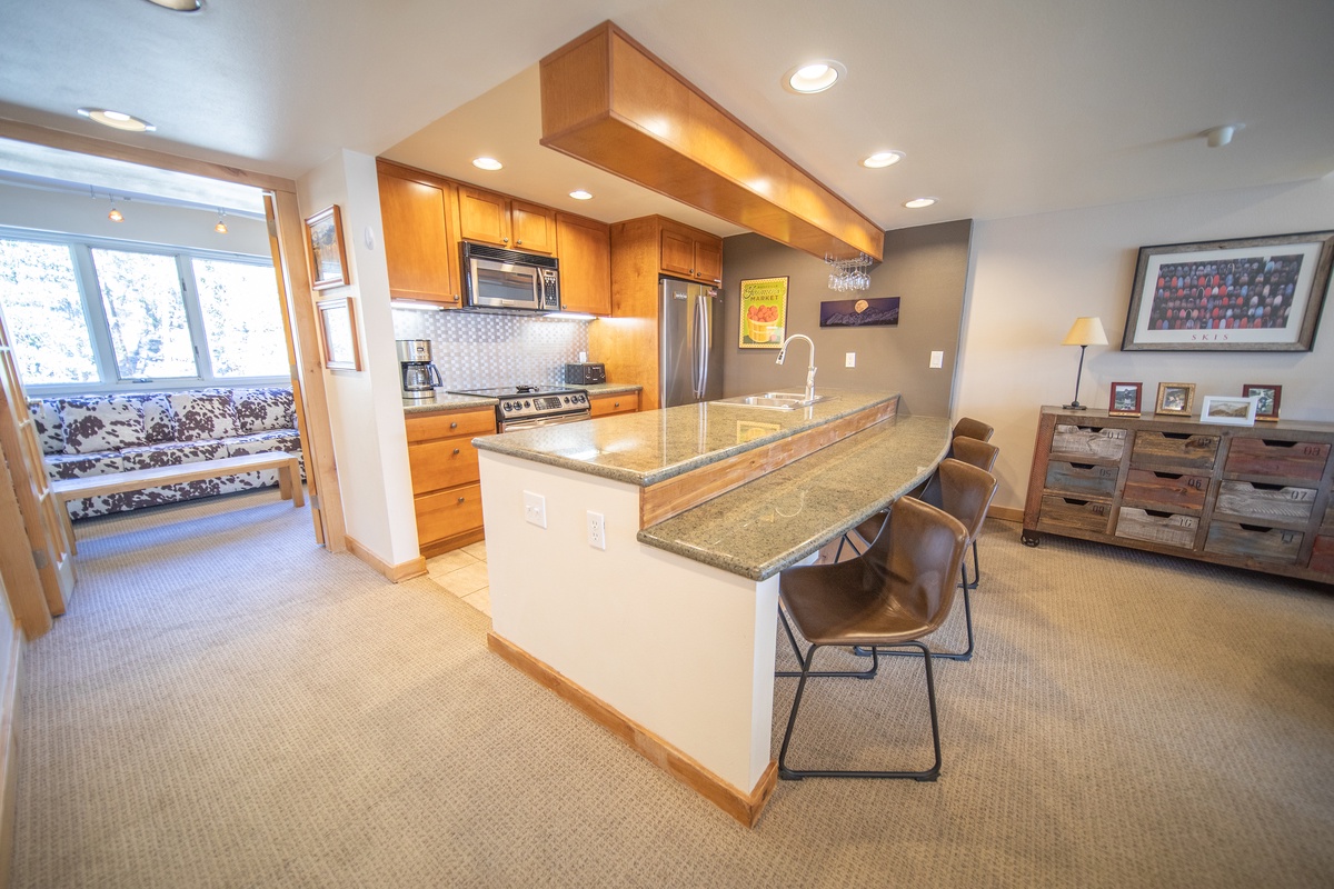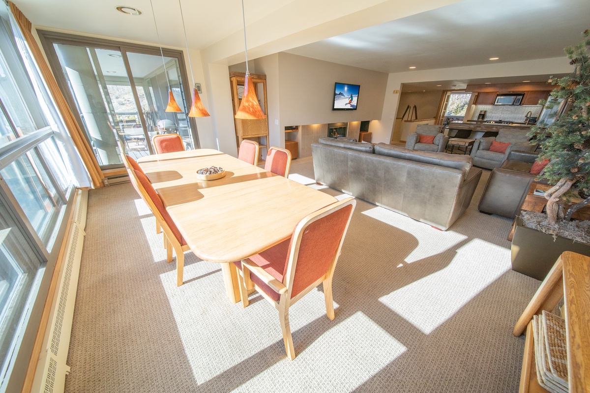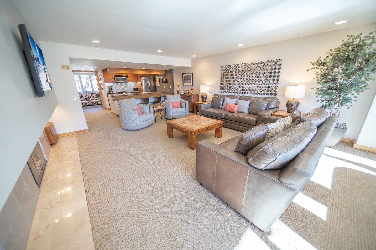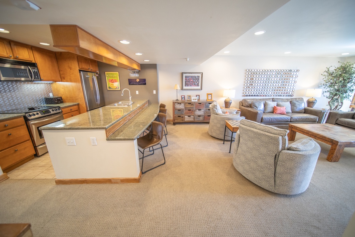 The spacious living area is an ideal spot to unwind after exploring Keystone's beauty. Generous windows frame panoramic mountain views, flooding the room with natural light. Sink into plush sofas, bask in the fireplace's glow, and recount the day's adventures with loved ones. The open layout seamlessly connects the living space to the fully equipped kitchen, perfect for preparing delicious meals and hosting gatherings.