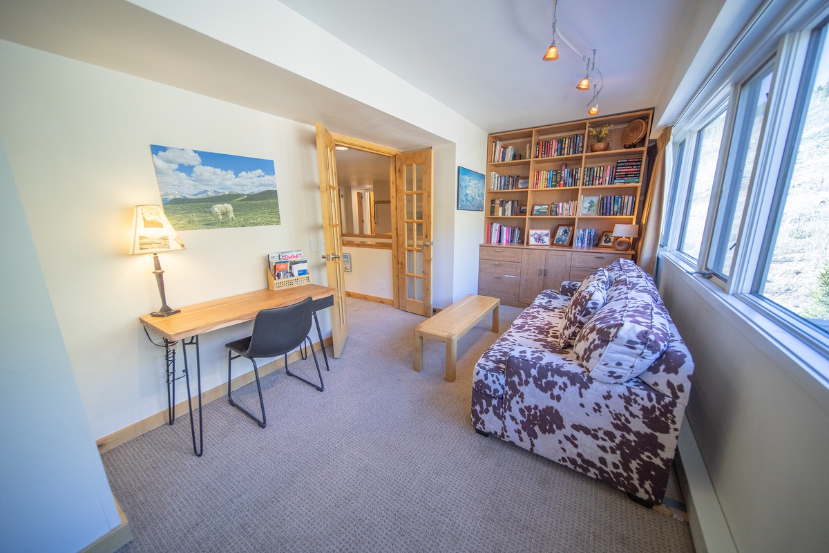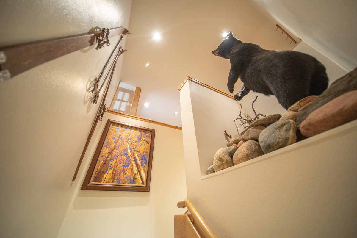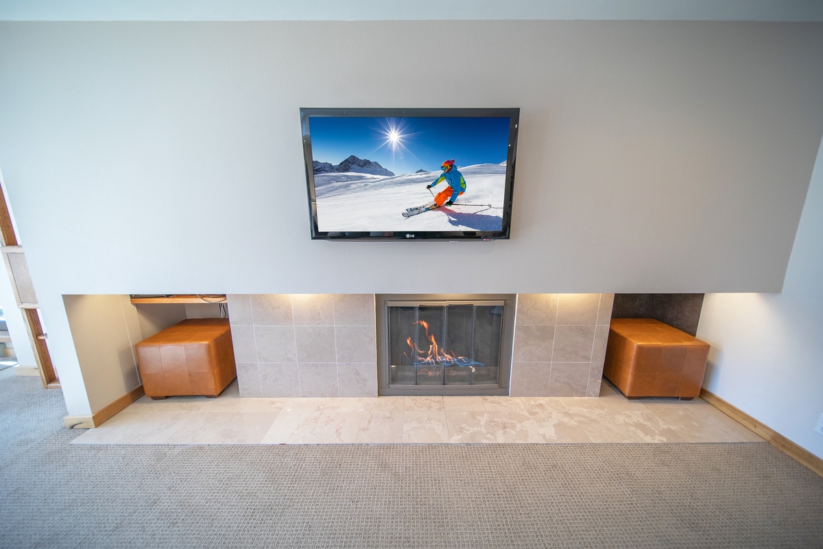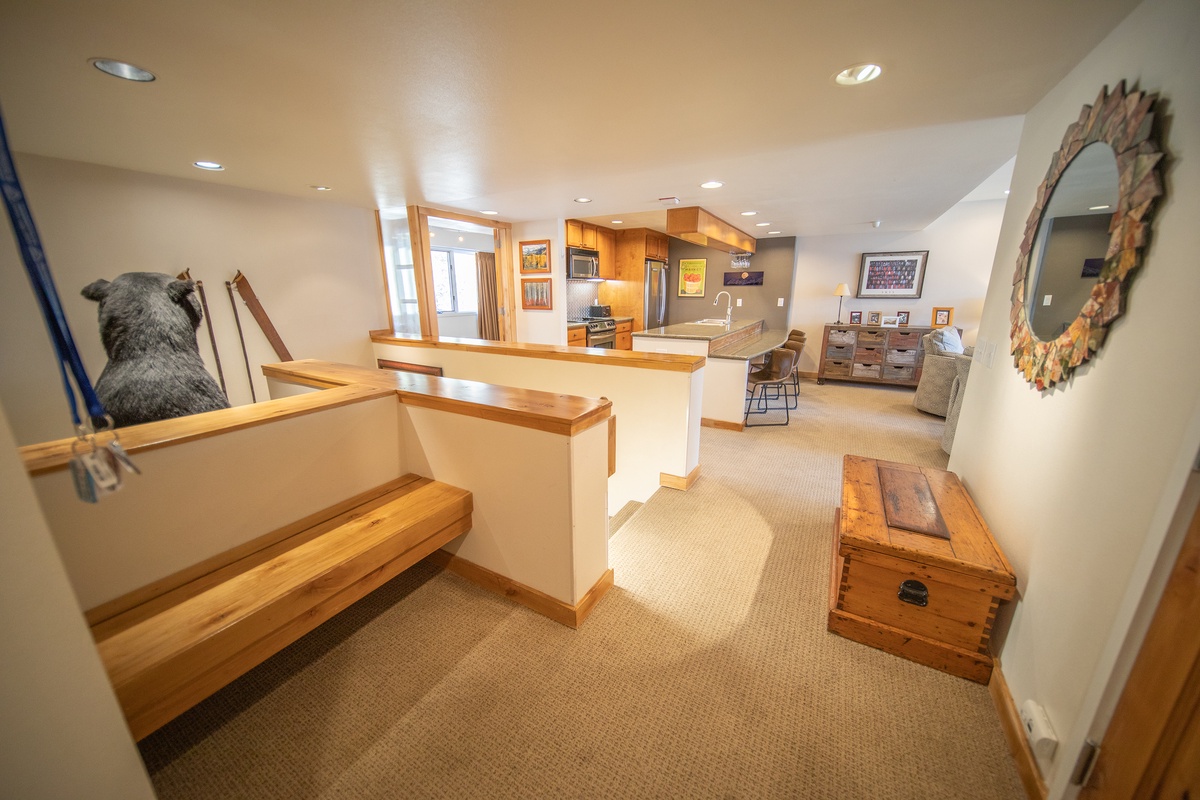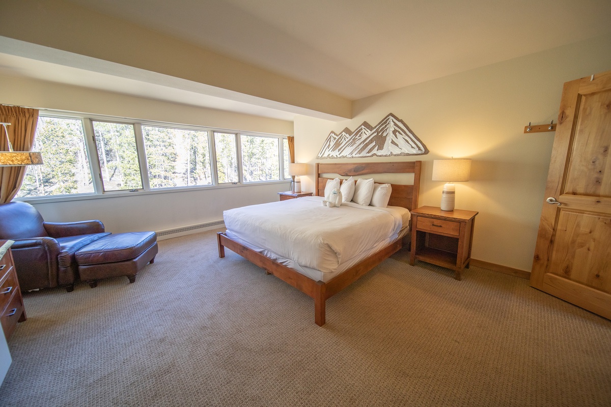 The spacious living area is an ideal spot to unwind after exploring Keystone's beauty. Generous windows frame panoramic mountain views, flooding the room with natural light. Sink into plush sofas, bask in the fireplace's glow, and recount the day's adventures with loved ones. The open layout seamlessly connects the living space to the fully equipped kitchen, perfect for preparing delicious meals and hosting gatherings.