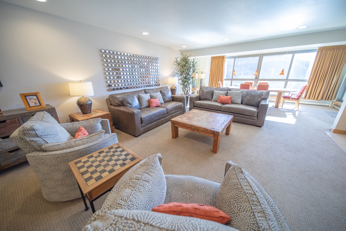 Positioned as a corner unit on the 6th floor, the expansive balcony boasts stunning vistas of the Ten Mile Range and Keystone Ski Mountain. Equally captivating is the condo's tasteful blend of rustic charm and modern comfort. The inviting living room and welcoming bedrooms are bathed in natural light from floor-to-ceiling windows, creating a warm and relaxing atmosphere.