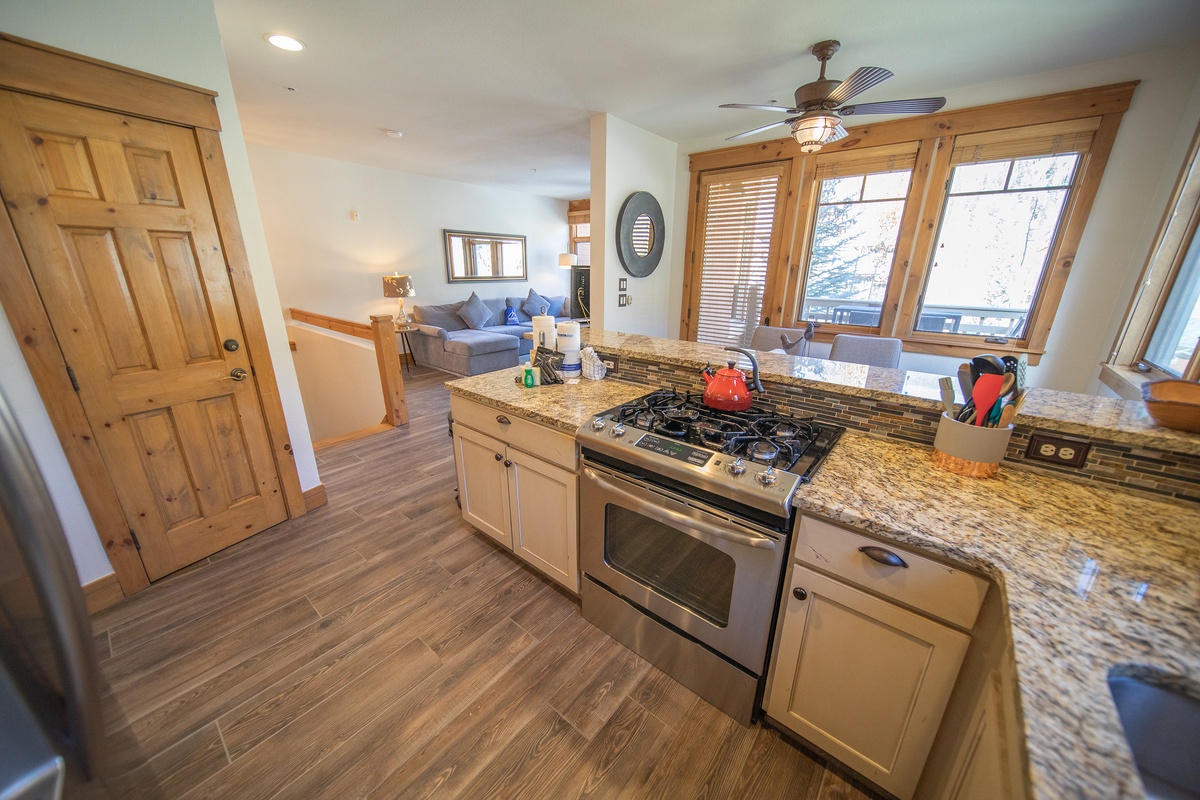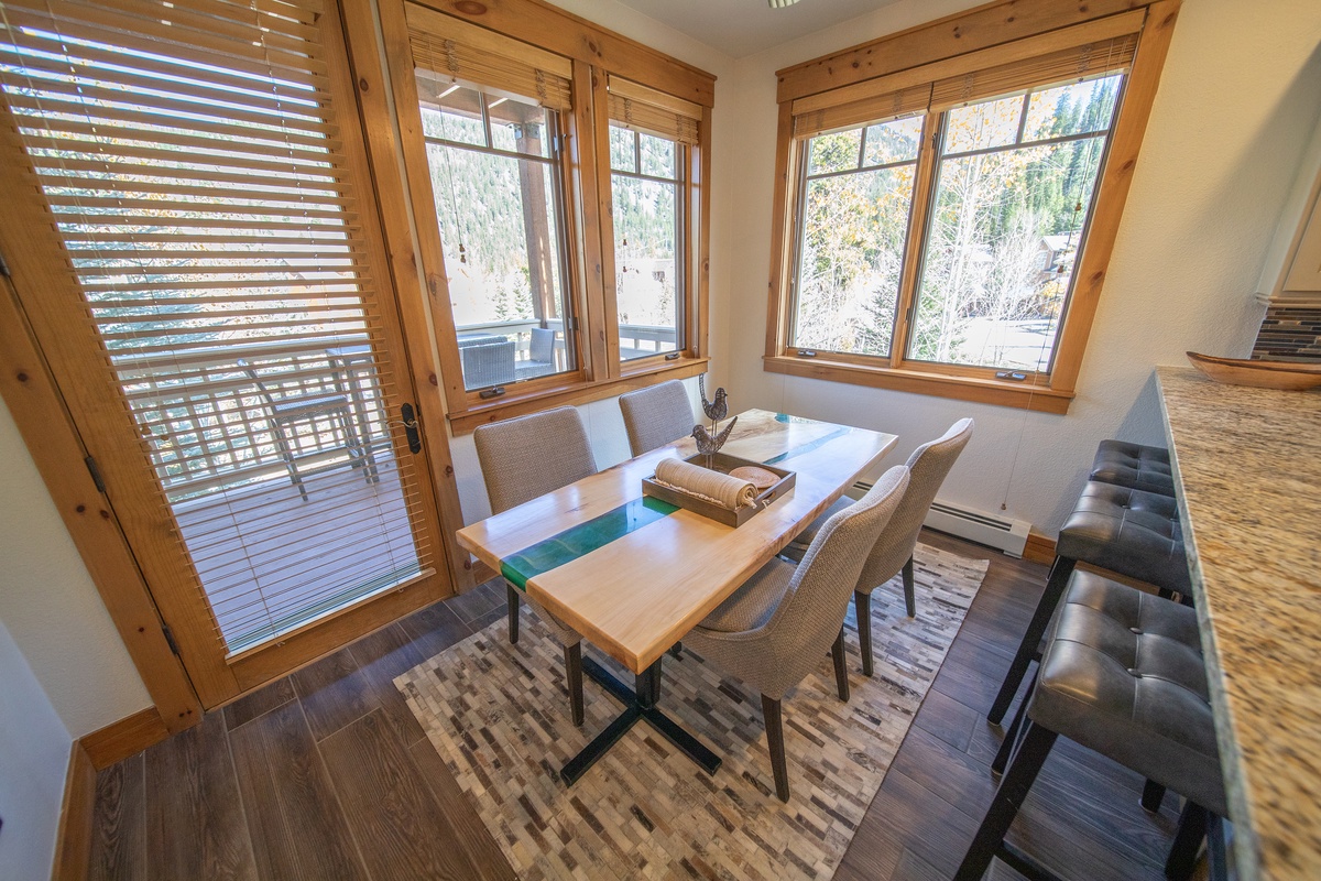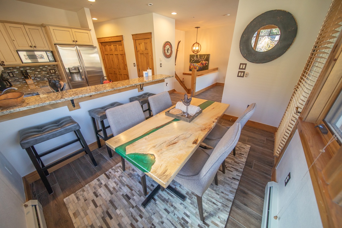 The large windows at Settlers Creek 6536 welcome in the Colorado sunshine, brightening the entire Main floor. The warm, tasteful decor and natural lighting create a cozy yet sophisticated space, ideal for unwinding after a day of adventure. Relax by the fireplace, enjoying the tranquil ambiance and mountain scenery. With a fully equipped kitchen, dining area, and ample seating, you can gather for memorable meals or enjoy a good board game with family and friends.