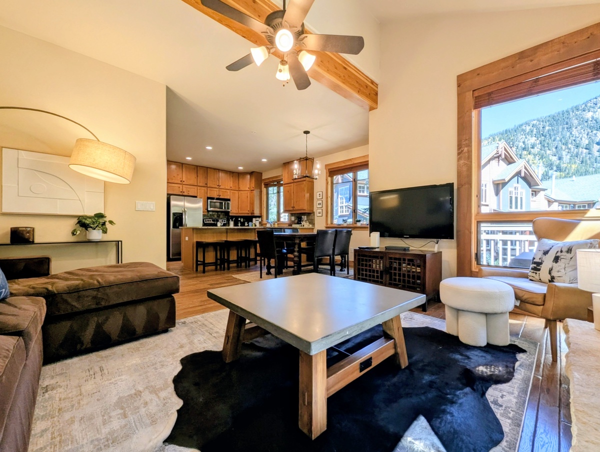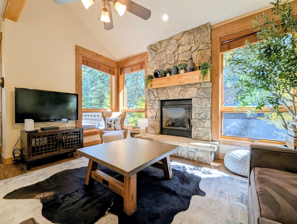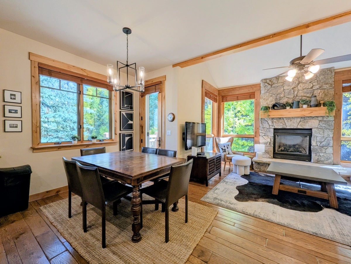 Step inside and you’ll find a warm, inviting living area with high ceilings and large windows that let in plenty of natural light. The open-concept layout makes it easy to relax with friends and family after a day on the mountain. A stone fireplace anchors the living room, creating the perfect spot to curl up with a cup of cocoa or unwind with a movie. The décor strikes a balance between mountain charm and modern comfort, ensuring you feel right at home.