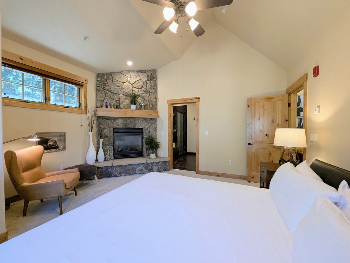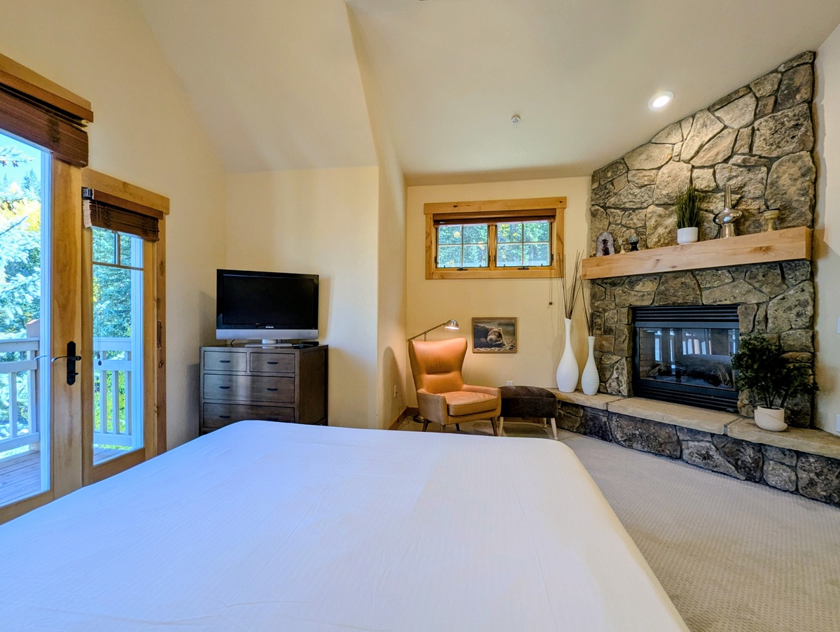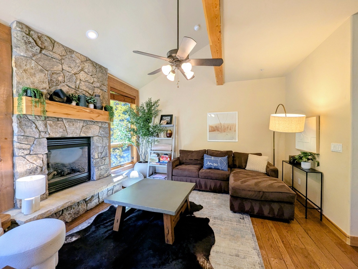 Step inside and you’ll find a warm, inviting living area with high ceilings and large windows that let in plenty of natural light. The open-concept layout makes it easy to relax with friends and family after a day on the mountain. A stone fireplace anchors the living room, creating the perfect spot to curl up with a cup of cocoa or unwind with a movie. The décor strikes a balance between mountain charm and modern comfort, ensuring you feel right at home.