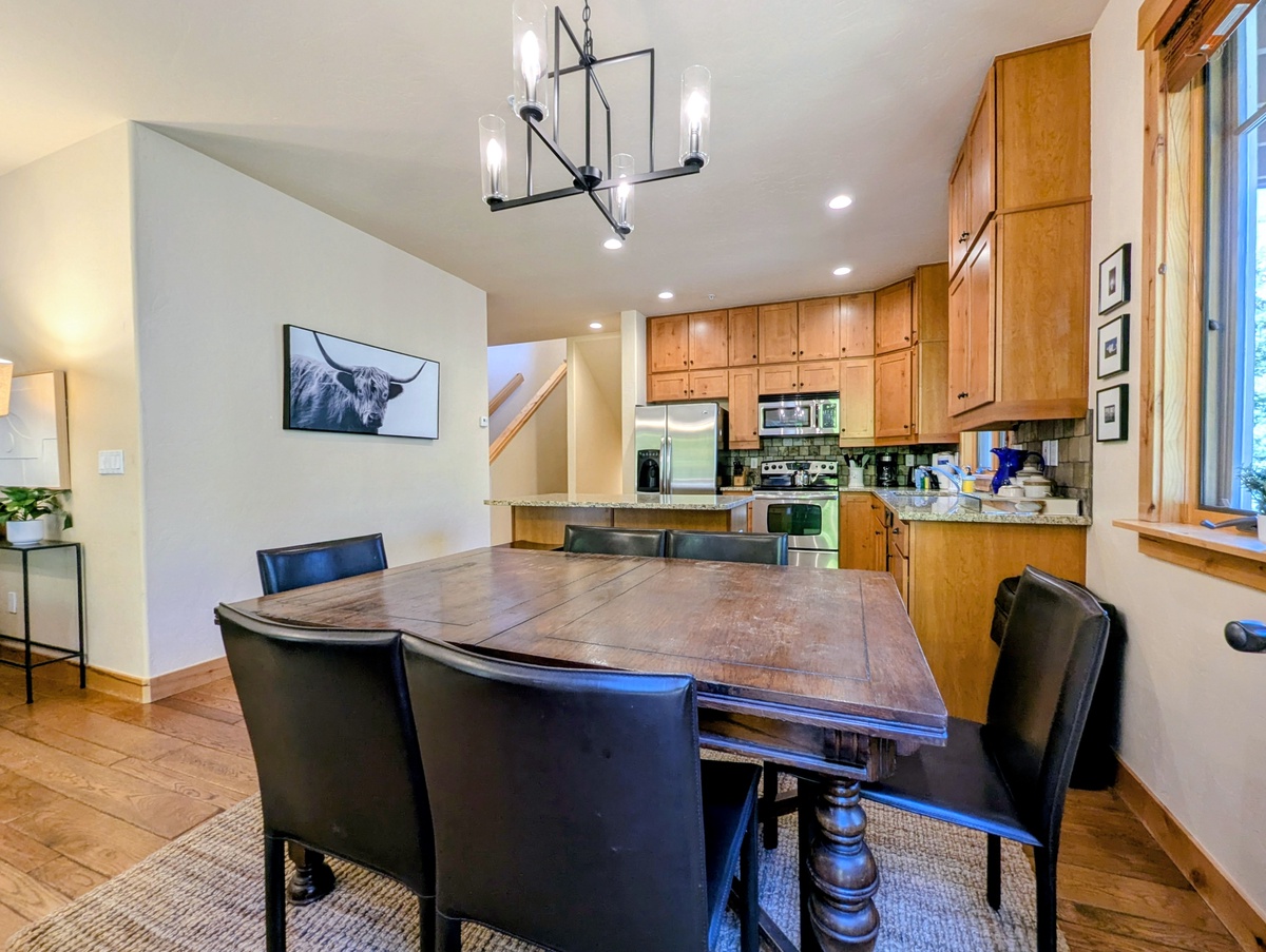 The fully equipped kitchen is designed for both casual meals and shared feasts. Featuring stainless steel appliances, ample counter space, and a convenient breakfast bar, it has everything you need to prepare anything from quick snacks to hearty dinners. The adjacent dining area offers plenty of room for your group to gather, with views of the surrounding forest adding to the mountain lodge atmosphere.